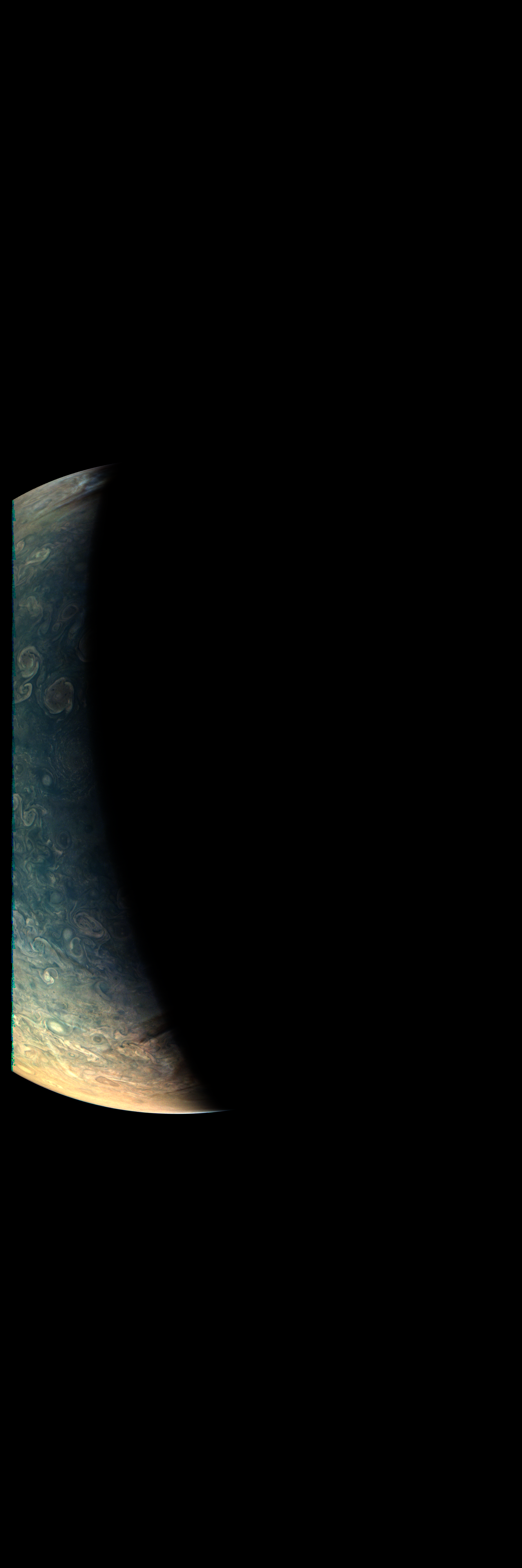 Junocam pixels are 12 bits deep from the camera but are converted to 8 bits inside the instrument using a lossless "companding" table, a process similar to gamma correction, to reduce their size. All Junocam products on the missionjuno website are in this 8-bit form as received on Earth. Scientific users interested in radiometric analysis should use the "RDR" data products archived with the Planetary Data System, which have been converted back to a linear 12-bit scale.