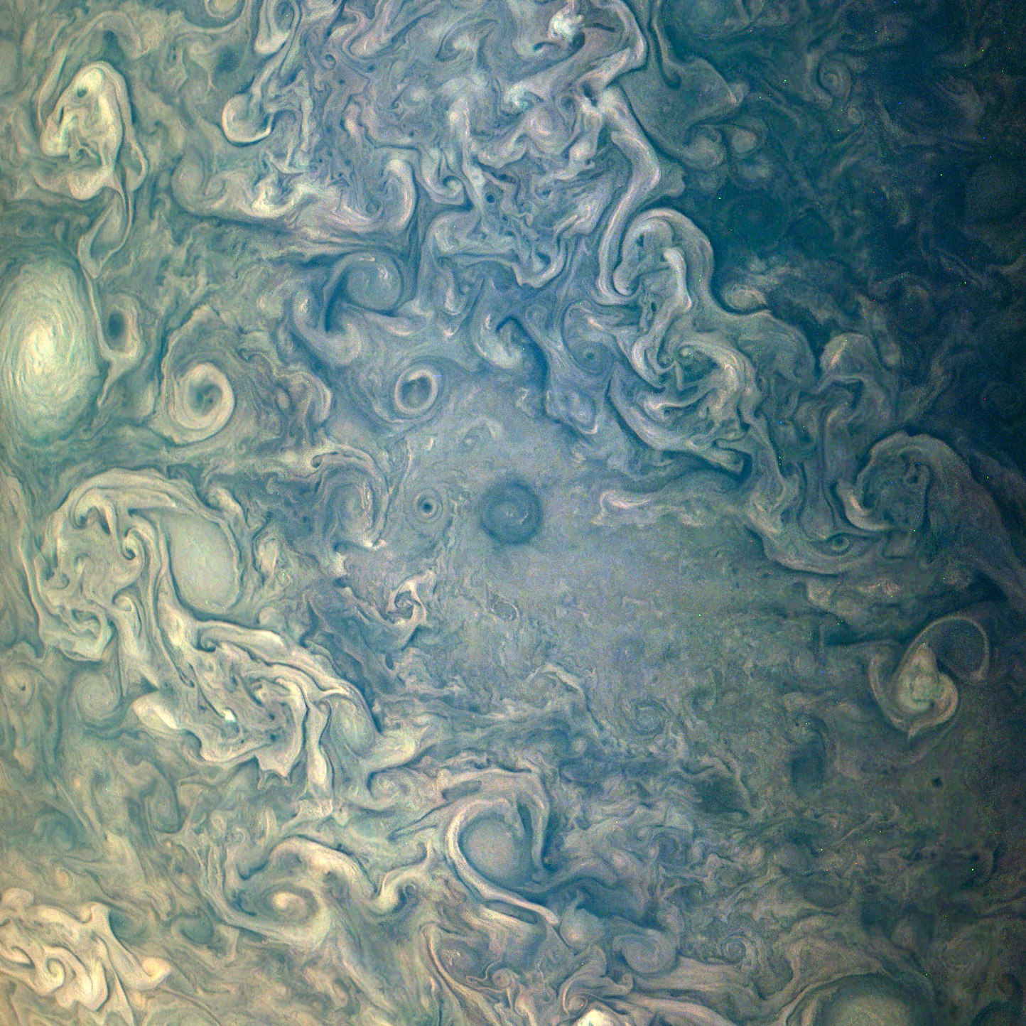 Junocam pixels are 12 bits deep from the camera but are converted to 8 bits inside the instrument using a lossless "companding" table, a process similar to gamma correction, to reduce their size. All Junocam products on the missionjuno website are in this 8-bit form as received on Earth. Scientific users interested in radiometric analysis should use the "RDR" data products archived with the Planetary Data System, which have been converted back to a linear 12-bit scale.