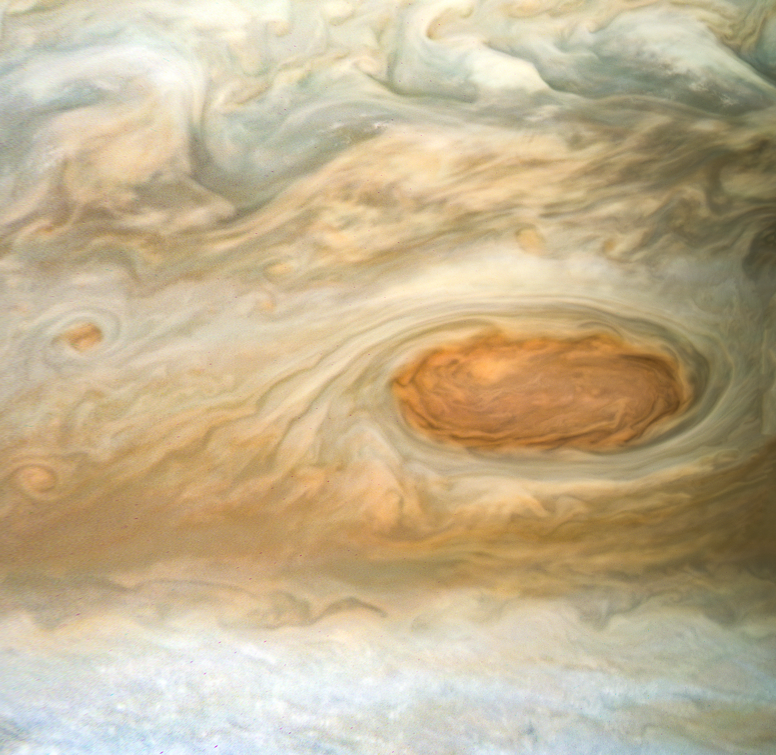 Junocam pixels are 12 bits deep from the camera but are converted to 8 bits inside the instrument using a lossless "companding" table, a process similar to gamma correction, to reduce their size. All Junocam products on the missionjuno website are in this 8-bit form as received on Earth. Scientific users interested in radiometric analysis should use the "RDR" data products archived with the Planetary Data System, which have been converted back to a linear 12-bit scale.