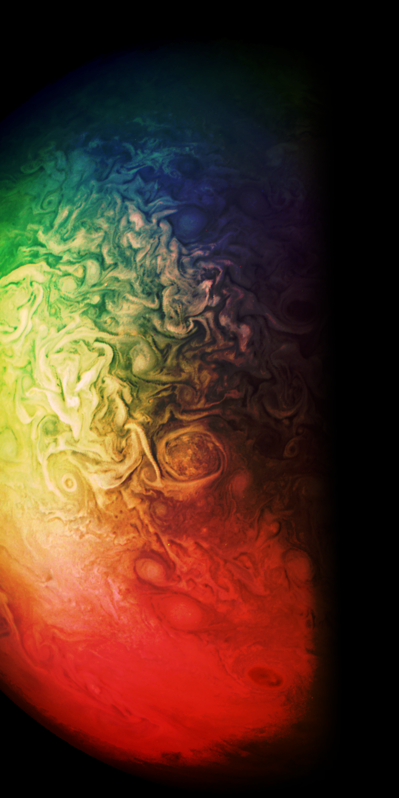 Junocam pixels are 12 bits deep from the camera but are converted to 8 bits inside the instrument using a lossless "companding" table, a process similar to gamma correction, to reduce their size. All Junocam products on the missionjuno website are in this 8-bit form as received on Earth. Scientific users interested in radiometric analysis should use the "RDR" data products archived with the Planetary Data System, which have been converted back to a linear 12-bit scale.