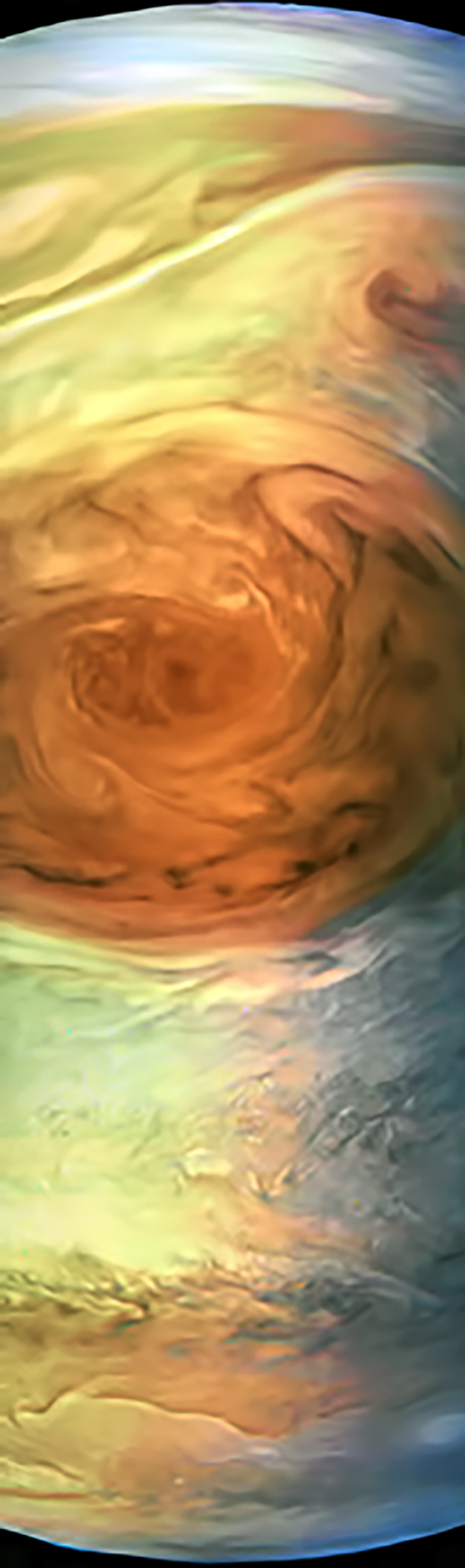 Junocam pixels are 12 bits deep from the camera but are converted to 8 bits inside the instrument using a lossless "companding" table, a process similar to gamma correction, to reduce their size. All Junocam products on the missionjuno website are in this 8-bit form as received on Earth. Scientific users interested in radiometric analysis should use the "RDR" data products archived with the Planetary Data System, which have been converted back to a linear 12-bit scale.