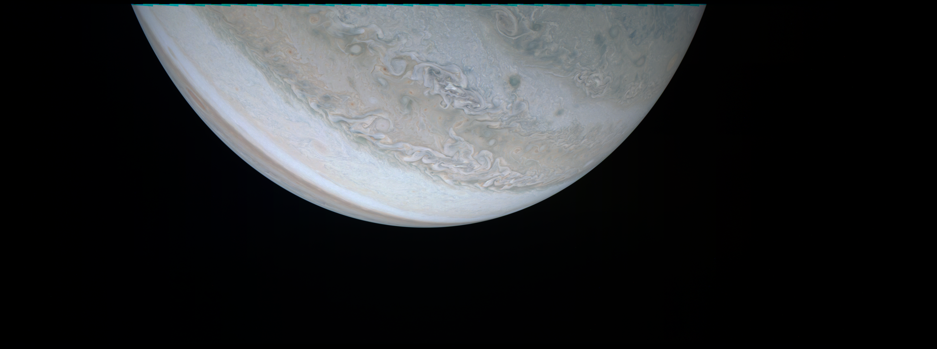 Junocam pixels are 12 bits deep from the camera but are converted to 8 bits inside the instrument using a lossless "companding" table, a process similar to gamma correction, to reduce their size. All Junocam products on the missionjuno website are in this 8-bit form as received on Earth. Scientific users interested in radiometric analysis should use the "RDR" data products archived with the Planetary Data System, which have been converted back to a linear 12-bit scale.