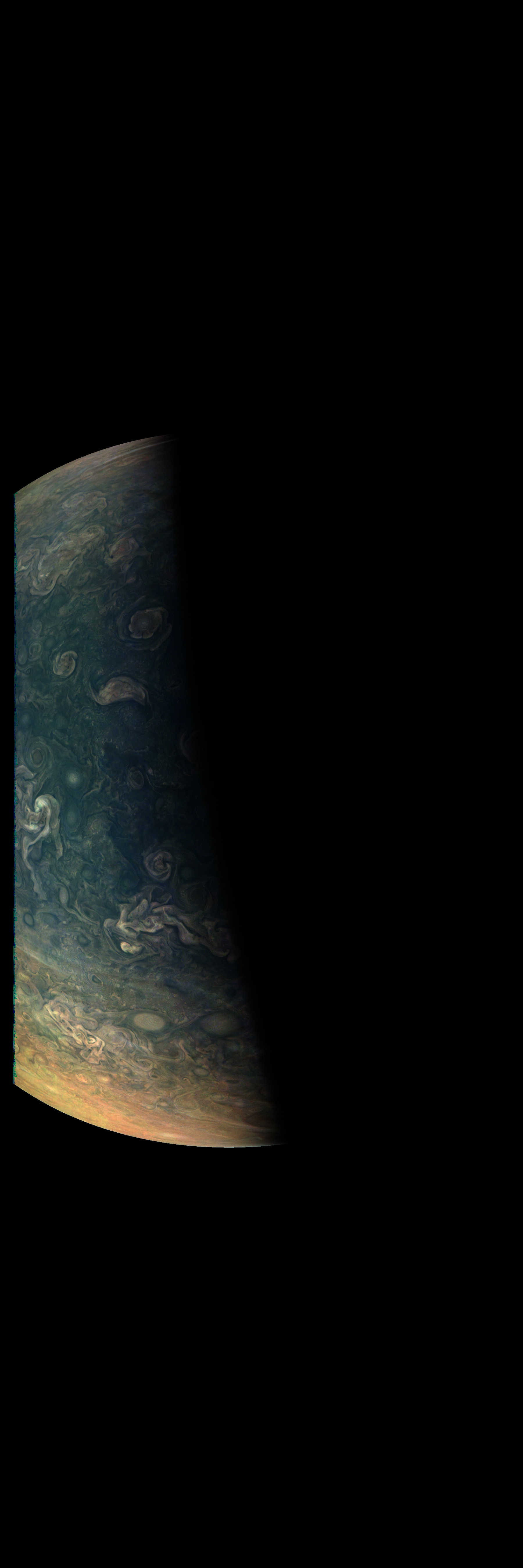 Resolution is 30 degrees per degree in an equdistant cylindrical system centered to the camera at image stop time, with an axis parallel to Juno's spin axis. The rendered field of view is 60x180 degrees.