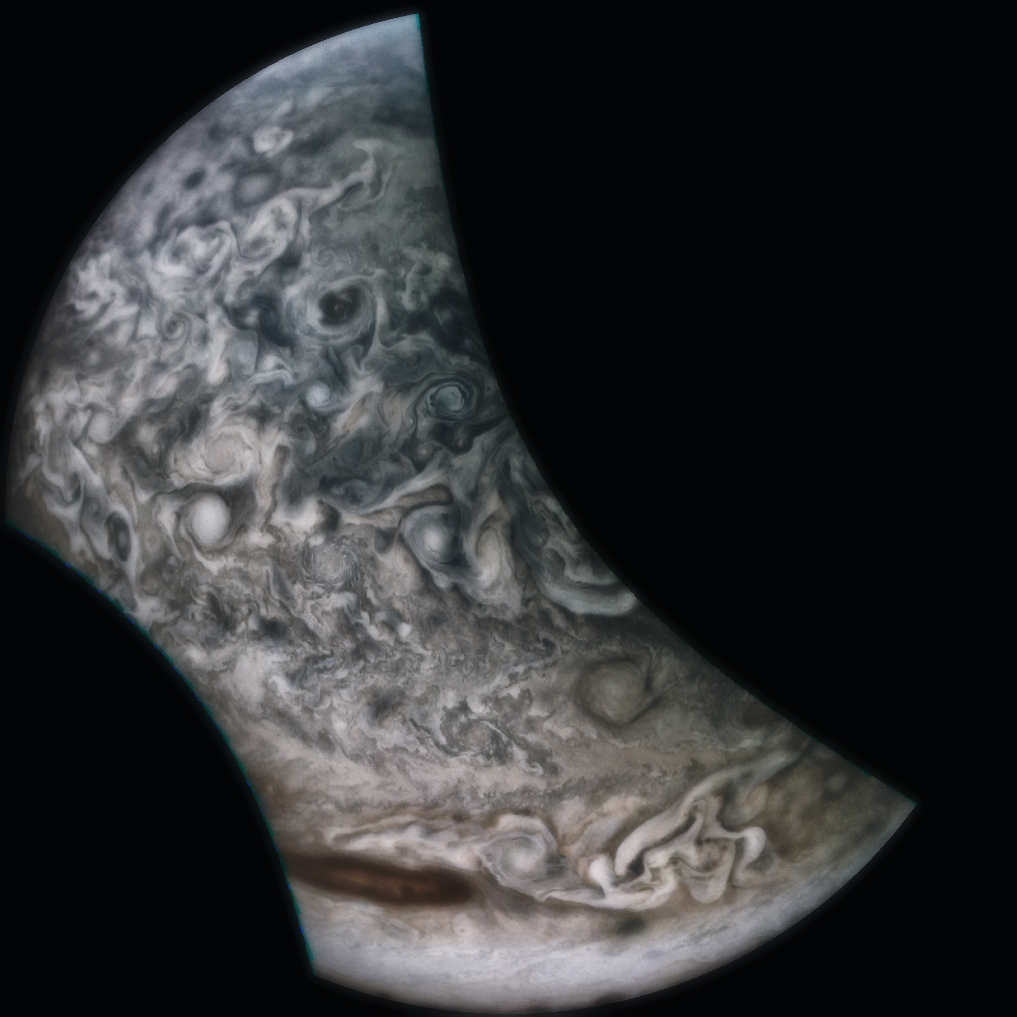 Junocam pixels are 12 bits deep from the camera but are converted to 8 bits inside the instrument using a lossless "companding" table, a process similar to gamma correction, to reduce their size. All Junocam products on the missionjuno website are in this 8-bit form as received on Earth. Scientific users interested in radiometric analysis should use the "RDR" data products archived with the Planetary Data System, which have been converted back to a linear 12-bit scale.