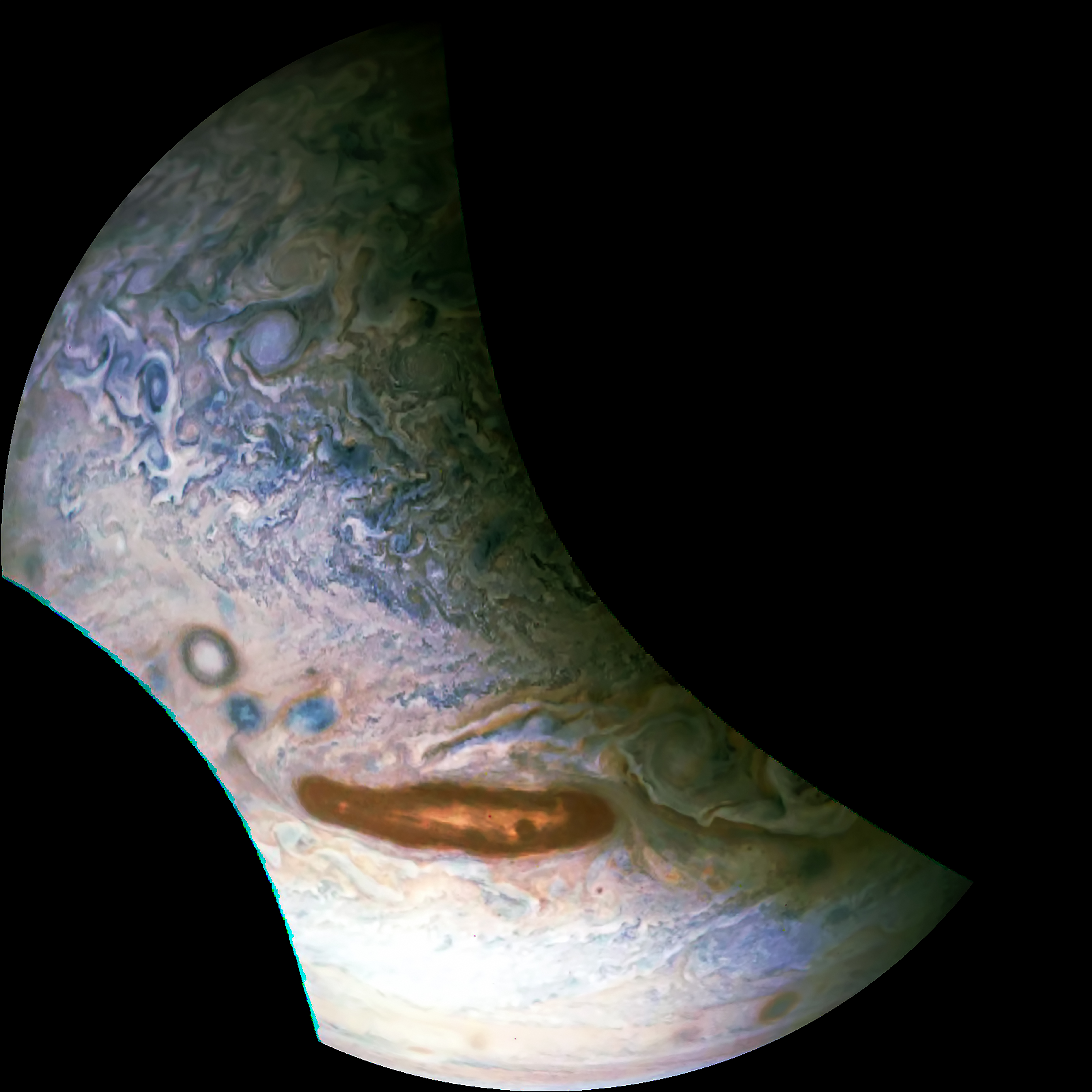 Junocam pixels are 12 bits deep from the camera but are converted to 8 bits inside the instrument using a lossless "companding" table, a process similar to gamma correction, to reduce their size. All Junocam products on the missionjuno website are in this 8-bit form as received on Earth. Scientific users interested in radiometric analysis should use the "RDR" data products archived with the Planetary Data System, which have been converted back to a linear 12-bit scale.