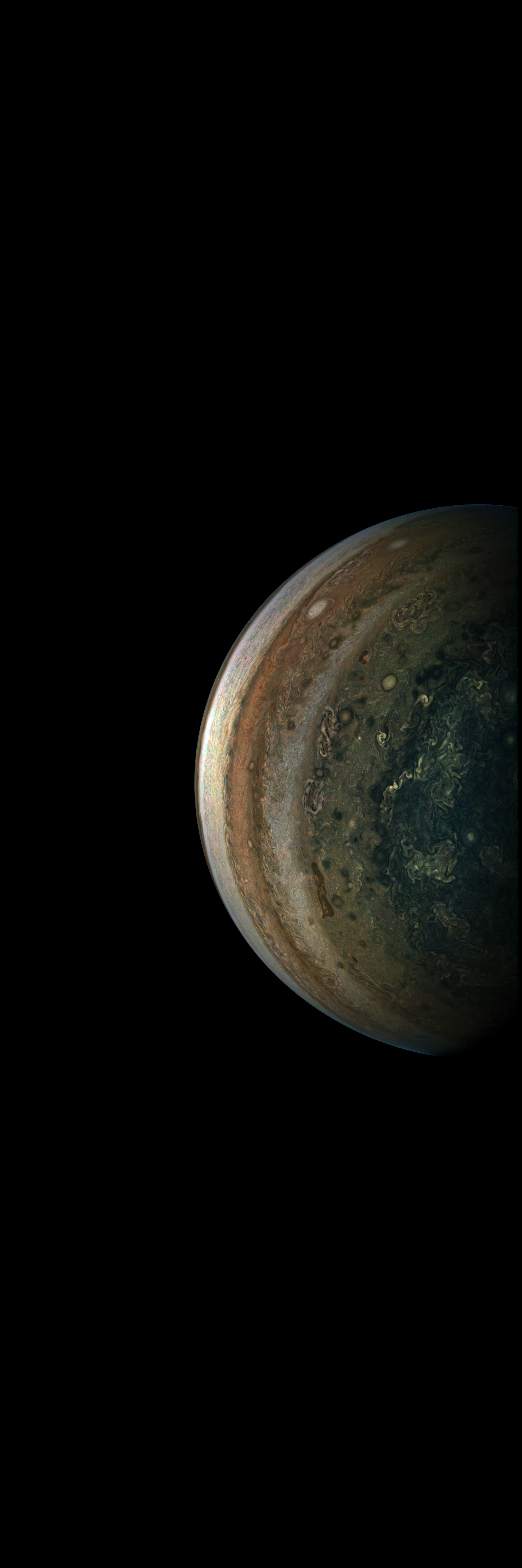 Resolution is 30 pixels per degrees in an equdistant cylindrical system centered to the camera at image stop time, with an axis parallel to Juno's spin axis. The rendered field of view is 60x180 degrees.