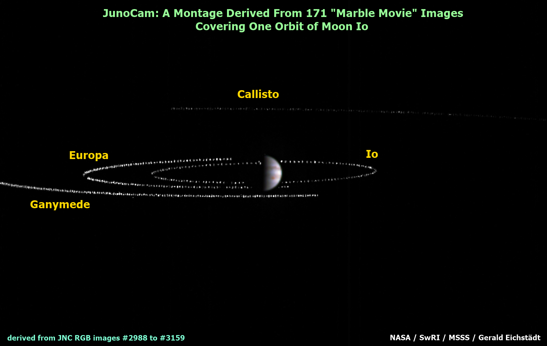 The moons are enhanced in the images only outside Jupiter's dayside. The traverse of the moons over Jupiter's dayside isn't shown in the montage.