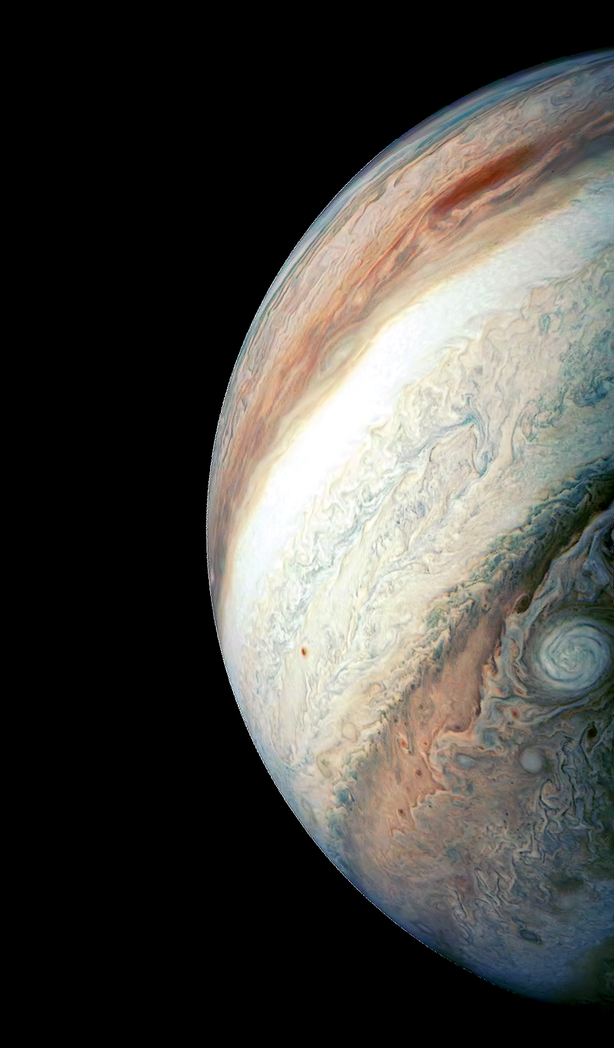 Junocam pixels are 12 bits deep from the camera but are converted to 8 bits inside the instrument using a lossless "companding" table, a process similar to gamma correction, to reduce their size. All Junocam products on the missionjuno website are in this 8-bit form as received on Earth. Scientific users interested in radiometric analysis should use the "RDR" data products archived with the Planetary Data System, which have been converted back to a linear 12-bit scale.