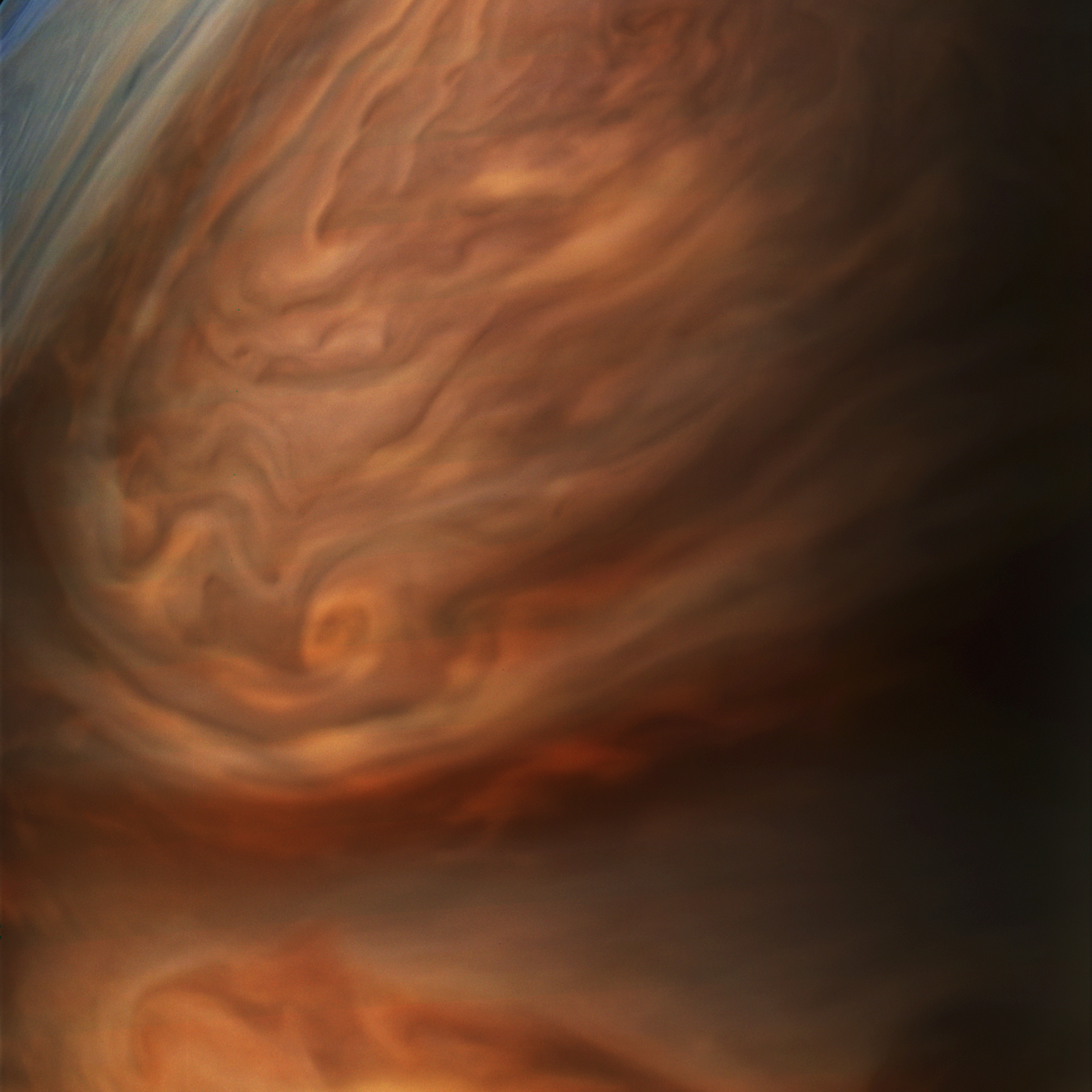 Junocam pixels are 12 bits deep from the camera but are converted to 8 bits inside the instrument using a lossless "companding" table, a process similar to gamma correction, to reduce their size. All Junocam products on the missionjuno website are in this 8-bit form as received on Earth. Scientific users interested in radiometric analysis should use the "RDR" data products archived with the Planetary Data System, which have been converted back to a linear 12-bit scale.