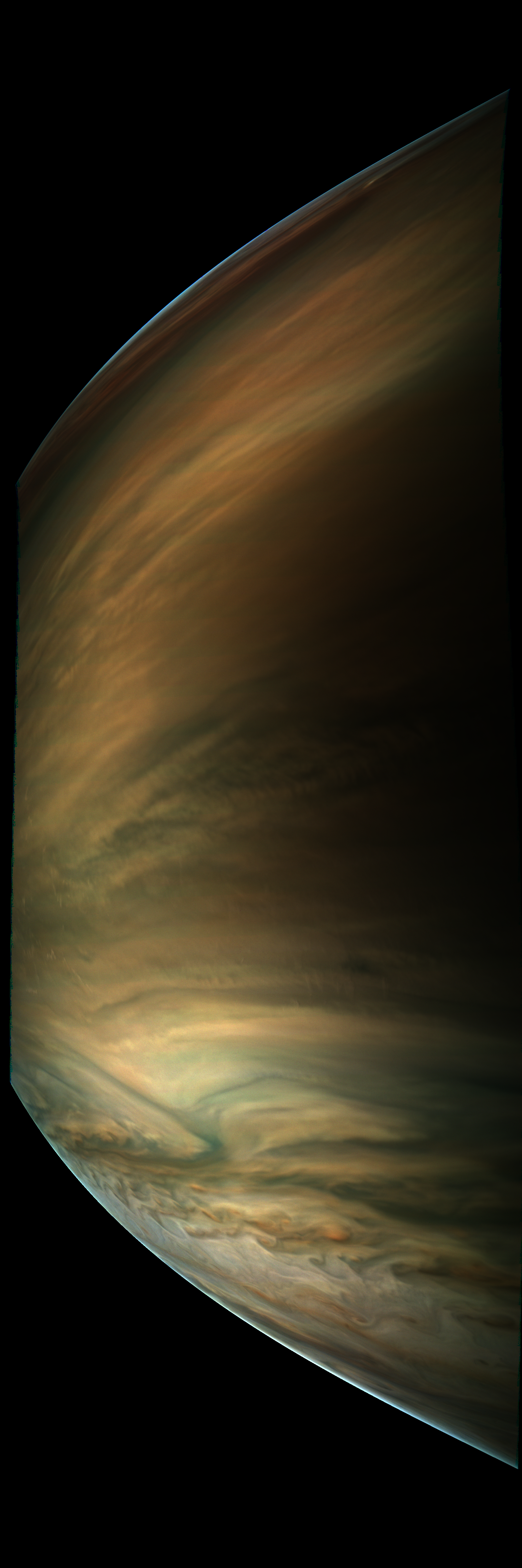 Resolution is 30 pixels per degrees in an equidistant cylindrical system centered to the camera at image stop time, with an axis parallel to Juno's spin axis. The rendered field of view is 60x180 degrees.