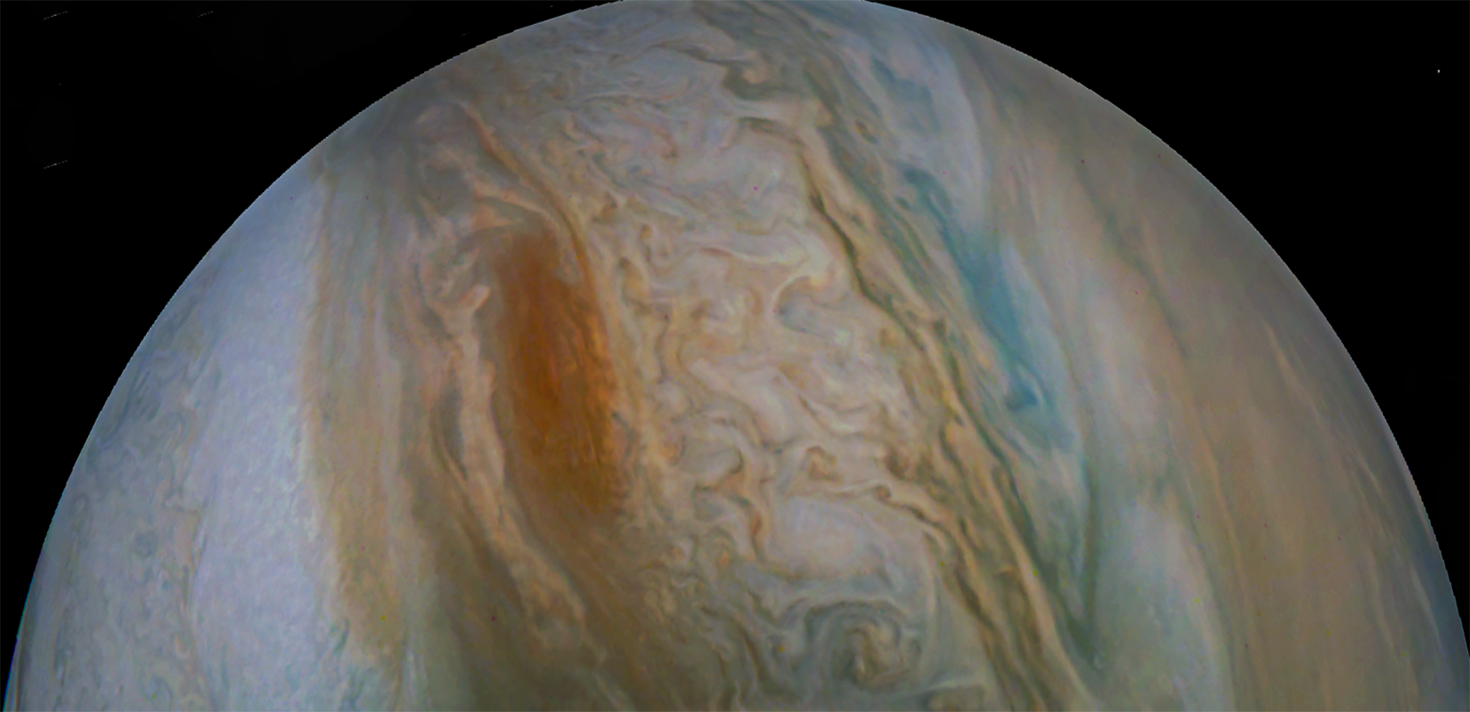 Junocam pixels are 12 bits deep from the camera but are converted to 8 bits inside the instrument using a lossless "companding" table, a process similar to gamma correction, to reduce their size. All Junocam products on the missionjuno website are in this 8-bit form as received on Earth. Scientific users interested in radiometric analysis should use the "RDR" data products archived with the Planetary Data System, which have been converted back to a linear 12-bit scale.