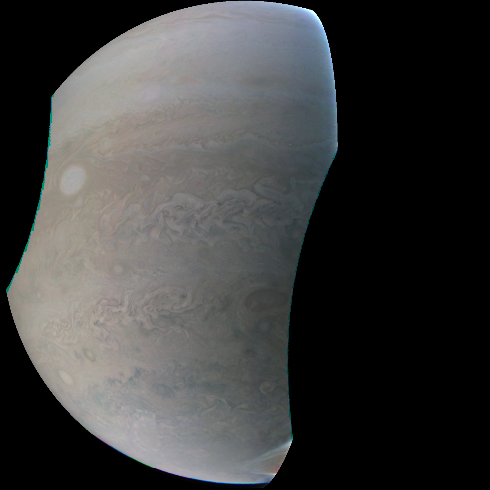 Junocam pixels are 12 bits deep from the camera but are converted to 8 bits inside the instrument using a lossless "companding" table, a process similar to gamma correction, to reduce their size. All Junocam products on the missionjuno website are in this 8-bit form as received on Earth. Scientific users interested in radiometric analysis should use the "RDR" data products archived with the Planetary Data System, which have been converted back to a linear 12-bit scale.