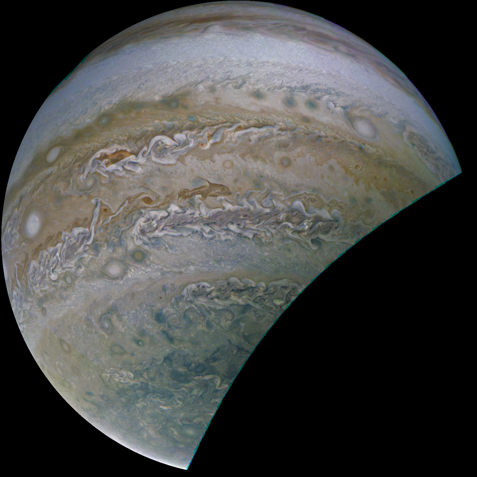 Junocam pixels are 12 bits deep from the camera but are converted to 8 bits inside the instrument using a lossless "companding" table, a process similar to gamma correction, to reduce their size. All Junocam products on the missionjuno website are in this 8-bit form as received on Earth. Scientific users interested in radiometric analysis should use the "RDR" data products archived with the Planetary Data System, which have been converted back to a linear 12-bit scale.