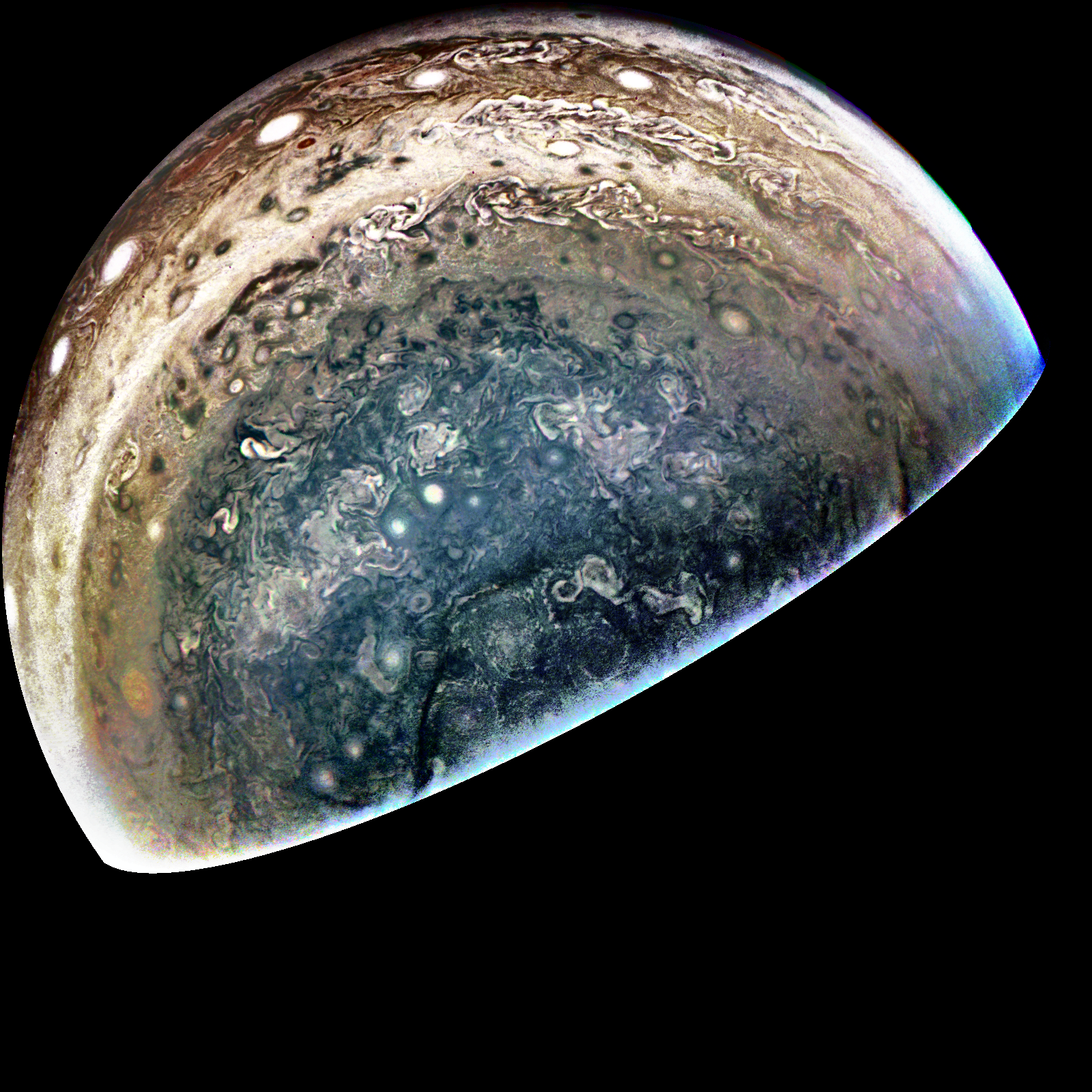 Junocam pixels are 12 bits deep from the camera but are converted to 8 bits inside the instrument using a lossless "companding" table, a process similar to gamma correction, to reduce their size. All Junocam products on the missionjuno website are in this 8-bit form as received on Earth. Scientific users interested in radiometric analysis should use the "RDR" data products archived with the Planetary Data System, which have been converted back to a linear 12-bit scale.