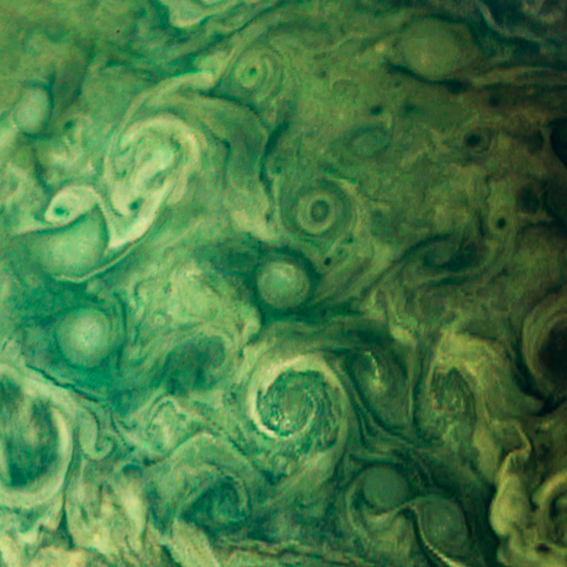 Junocam pixels are 12 bits deep from the camera but are converted to 8 bits inside the instrument using a lossless "companding" table, a process similar to gamma correction, to reduce their size. All Junocam products on the missionjuno website are in this 8-bit form as received on Earth. Scientific users interested in radiometric analysis should use the "RDR" data products archived with the Planetary Data System, which have been converted back to a linear 12-bit scale.