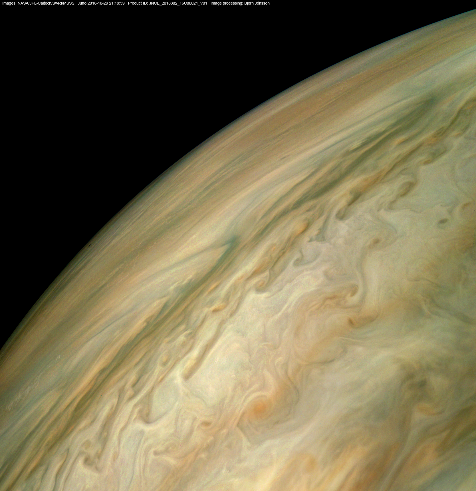An image processed from the PJ16_21 raw image framelets. The contrast/color has been exaggerated and small scale features sharpened.