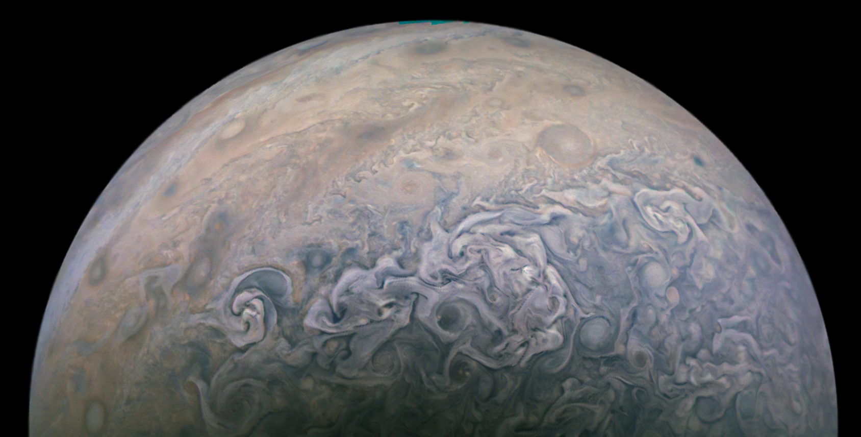 Junocam pixels are 12 bits deep from the camera but are converted to 8 bits inside the instrument using a lossless "companding" table, a process similar to gamma correction, to reduce their size. All Junocam products on the missionjuno website are in this 8-bit form as received on Earth. Scientific users interested in radiometric analysis should use the "RDR" data products archived with the Planetary Data System, which have been converted back to a linear 12-bit scale.