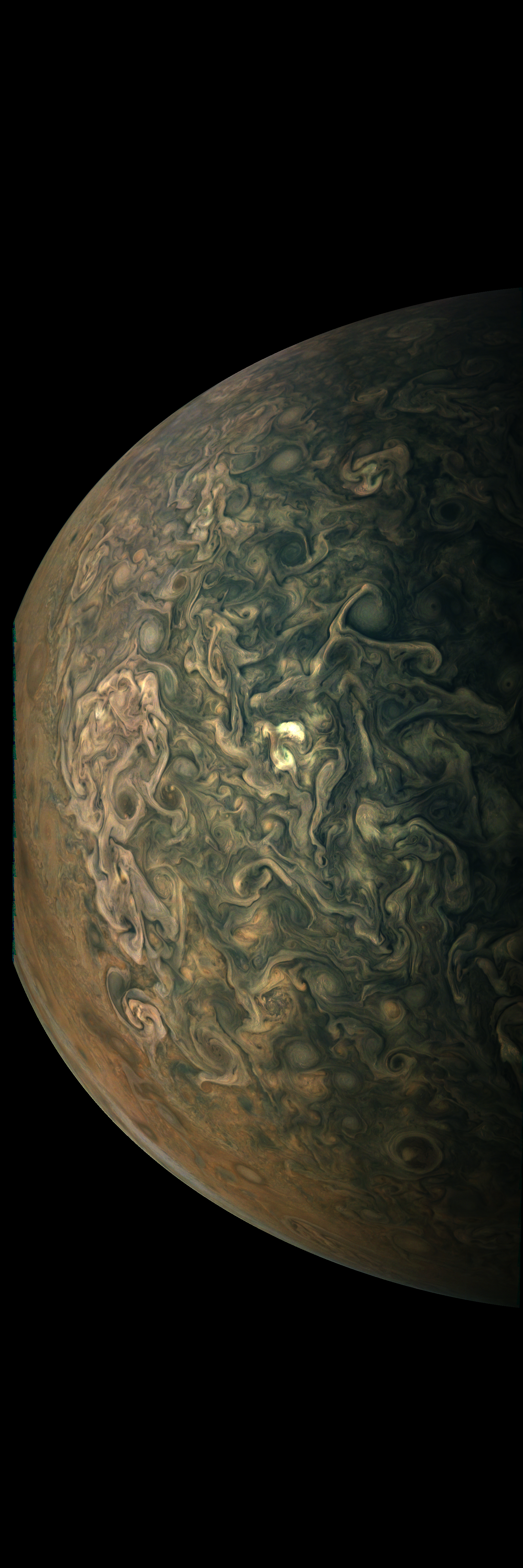 Junocam pixels are 12 bits deep from the camera but are converted to 8 bits inside the instrument using a lossless "companding" table, a process similar to gamma correction, to reduce their size. All Junocam products on the missionjuno website are in this 8-bit form as received on Earth. Scientific users interested in radiometric analysis should use the "RDR" data products archived with the Planetary Data System, which have been converted back to a linear 12-bit scale.