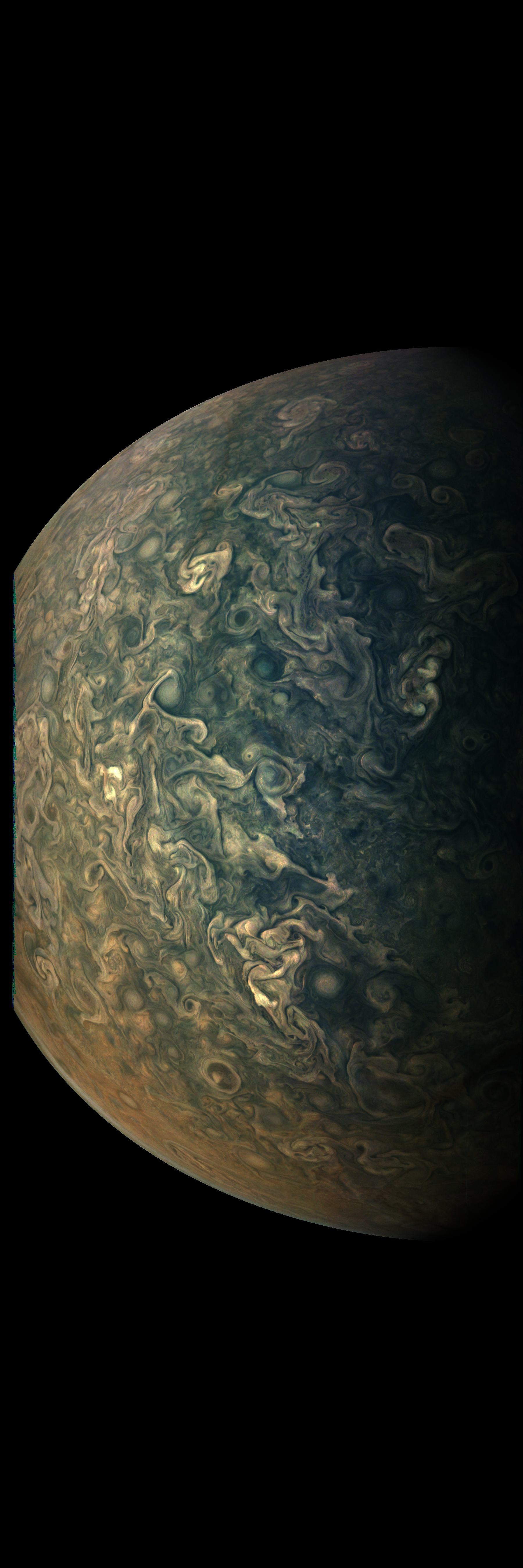 Junocam pixels are 12 bits deep from the camera but are converted to 8 bits inside the instrument using a lossless "companding" table, a process similar to gamma correction, to reduce their size. All Junocam products on the missionjuno website are in this 8-bit form as received on Earth. Scientific users interested in radiometric analysis should use the "RDR" data products archived with the Planetary Data System, which have been converted back to a linear 12-bit scale.