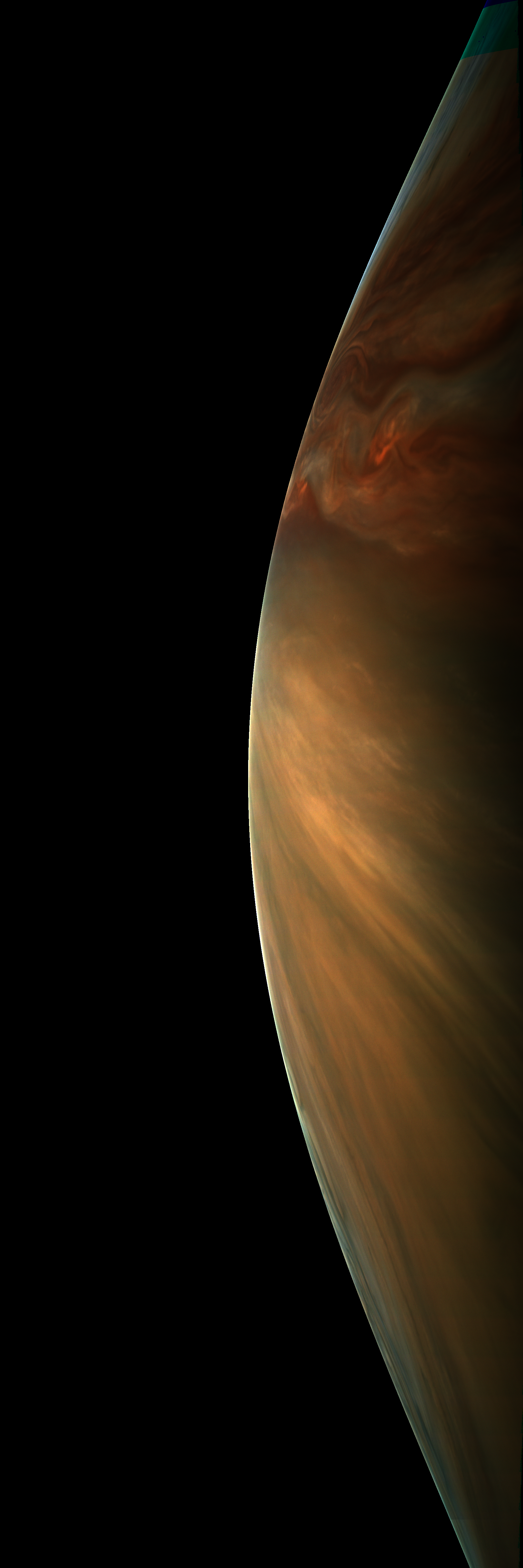 Resolution is 30 pixels per degrees in an equidistant cylindrical system centered to the camera at image stop time, with an axis parallel to Juno's spin axis. The rendered field of view is 60x180 degrees.