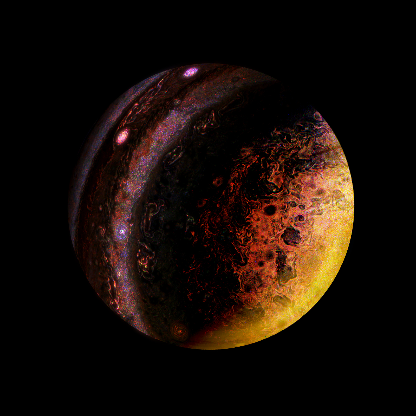 Sunrise on Jupiter with some curve processing and compositing the storms as if they were illuminated from below.