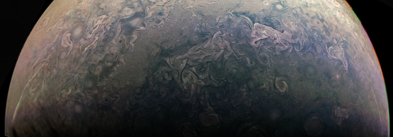 Junocam pixels are 12 bits deep from the camera but are converted to 8 bits inside the instrument using a lossless "companding" table, a process similar to gamma correction, to reduce their size. All Junocam products on the missionjuno website are in this 8-bit form as received on Earth. Scientific users interested in radiometric analysis should use the "RDR" data products archived with the Planetary Data System, which have been converted back to a linear 12-bit scale.