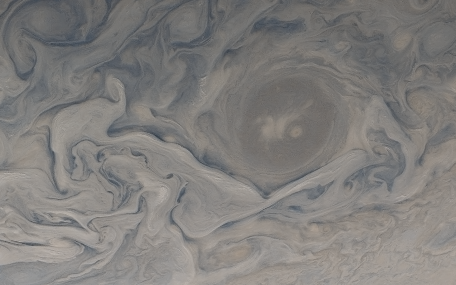 Enlarged and sharpened image of a brown cyclone located along polar jet stream N6. The cyclone interior appears to be a dynamic place, with several smaller cyclonic features rotating around the center of the system. Numerous small convective clouds are visible in the turbulent clouds in the left half of the image.