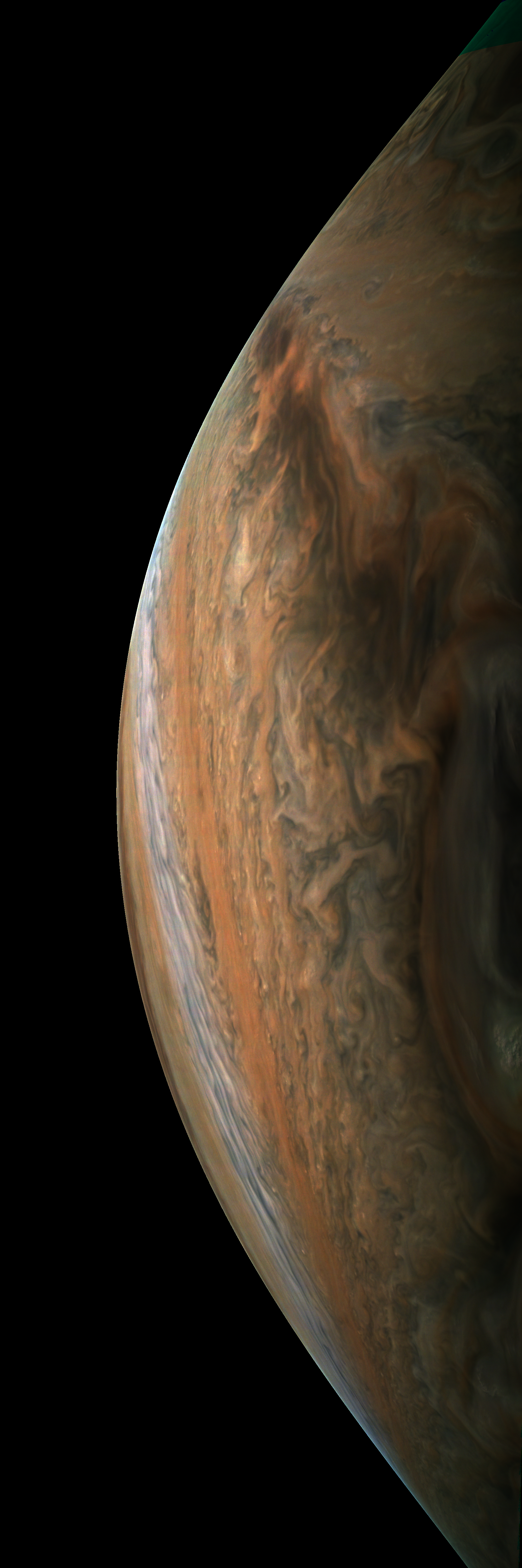 Resolution is 30 pixels per degrees in an equidistant cylindrical system centered to the camera at image stop time, with an axis parallel to Juno's spin axis. The rendered field of view is 60x180 degrees.
