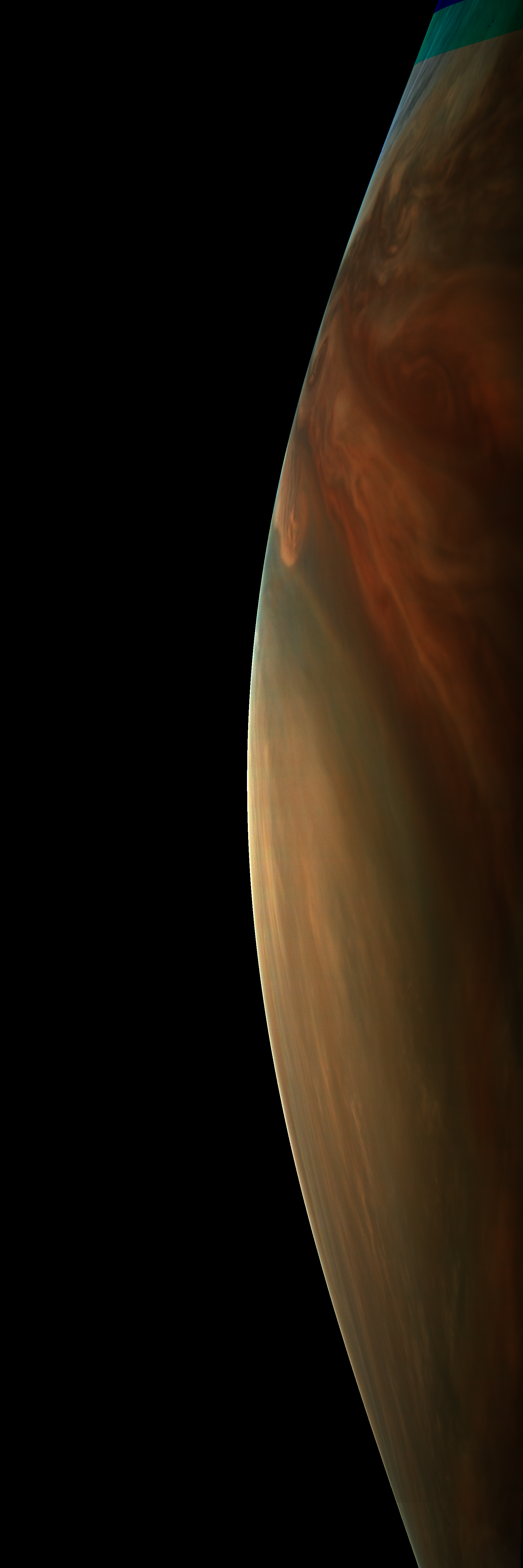 Resolution is 30 pixels per degrees in an equidistant cylindrical system centered to the camera at image stop time, with an axis parallel to Juno's spin axis. The rendered field of view is 60x180 degrees.