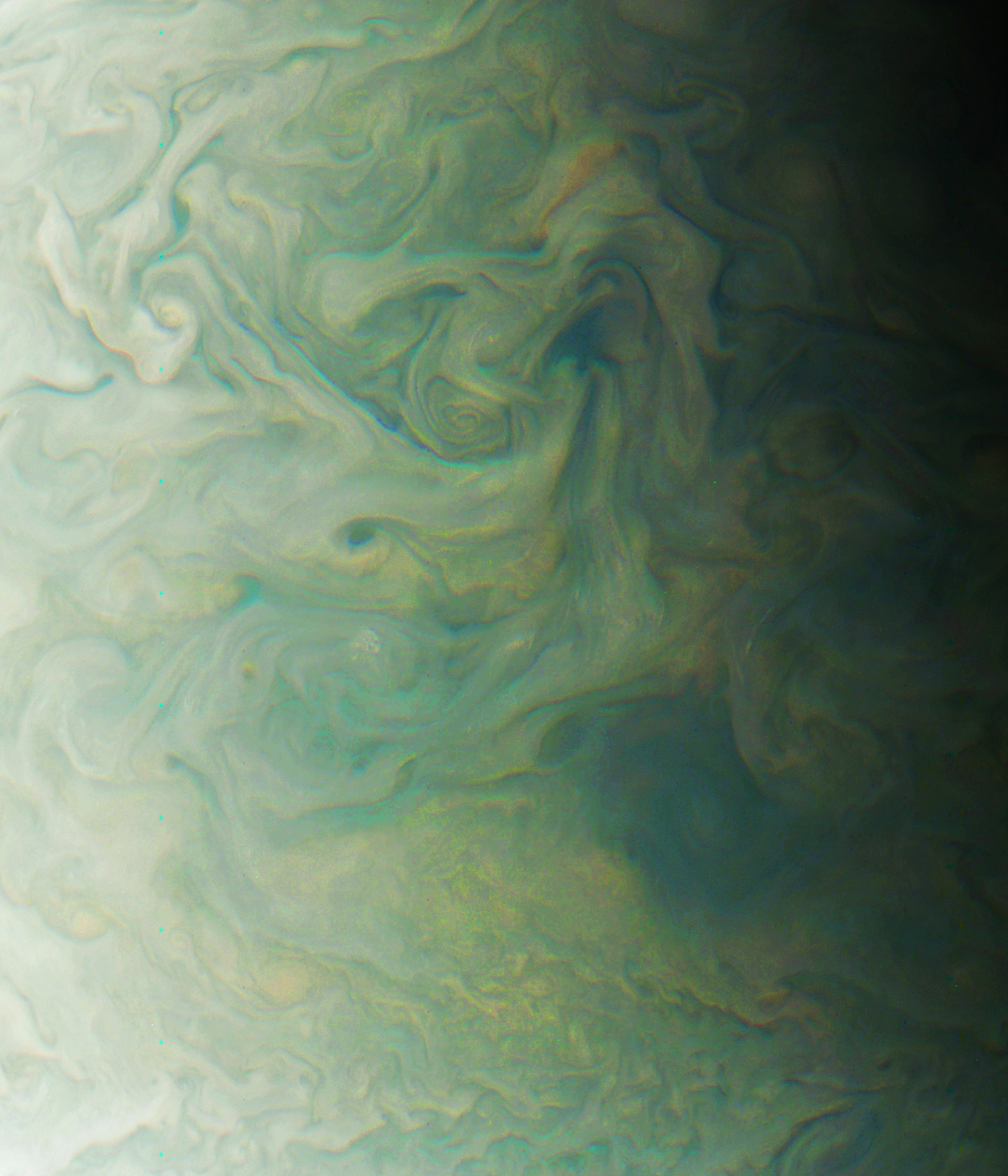 The image is derived from raw perijove 04 image #101. In the lower right quarter it shows a darkish vortex. It seems to be located on a lower level than the sourrounding cloud top. Another distinct, but smaller vortex is embedded in a rather chaotically structured cloud, located near the center of the upper half of the image.