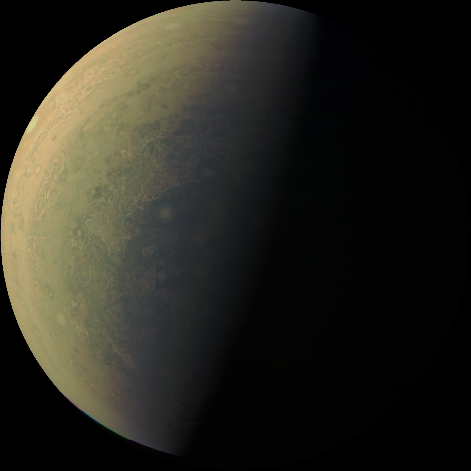 Junocam pixels are 12 bits deep from the camera but are converted to 8 bits inside the instrument using a lossless "companding" table, a process similar to gamma correction, to reduce their size. All Junocam products on the missionjuno website are in this 8-bit form as received on Earth. Scientific users interested in radiometric analysis should use the "RDR" data products archived with the Planetary Data System, which have been converted back to a linear 12-bit scale.