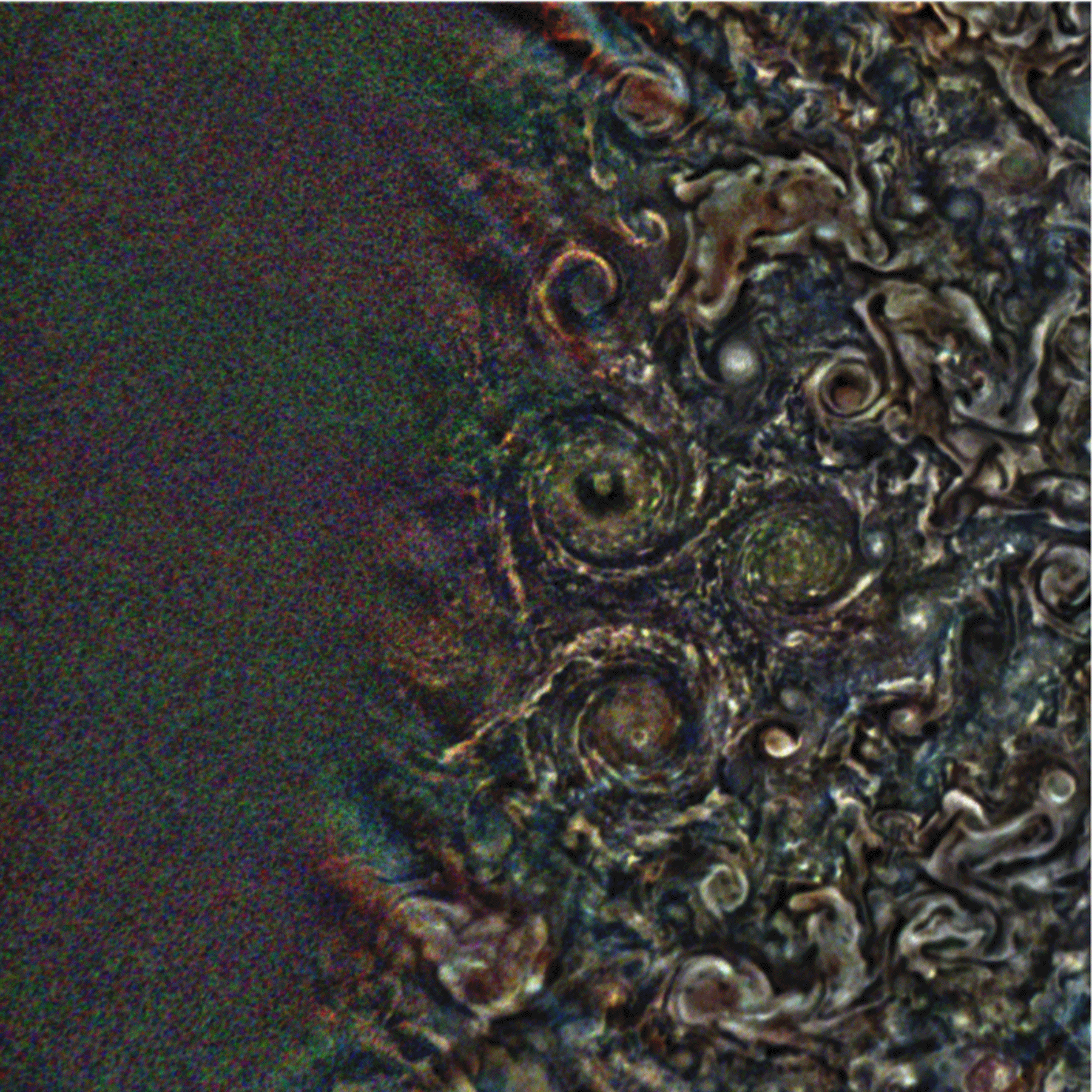 High-passed and stacked south polar equidistant azimuthal planetocentric maps are animated in this short animated gif. Each of the 10 still frames is a stack of 5 maps of consecutive Perijove 19 RGB images. Stacking reduced artifacts and image noise, but protected most of the detail.
