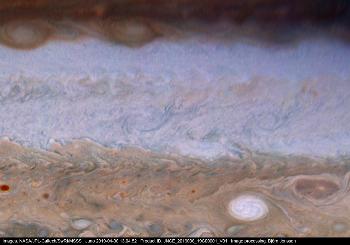 A severely enhanced map-projected image showing details of the three STB vortices. There is a bit more information about these vortices here: https://www.missionjuno.swri.edu/junocam/processing?id=6782