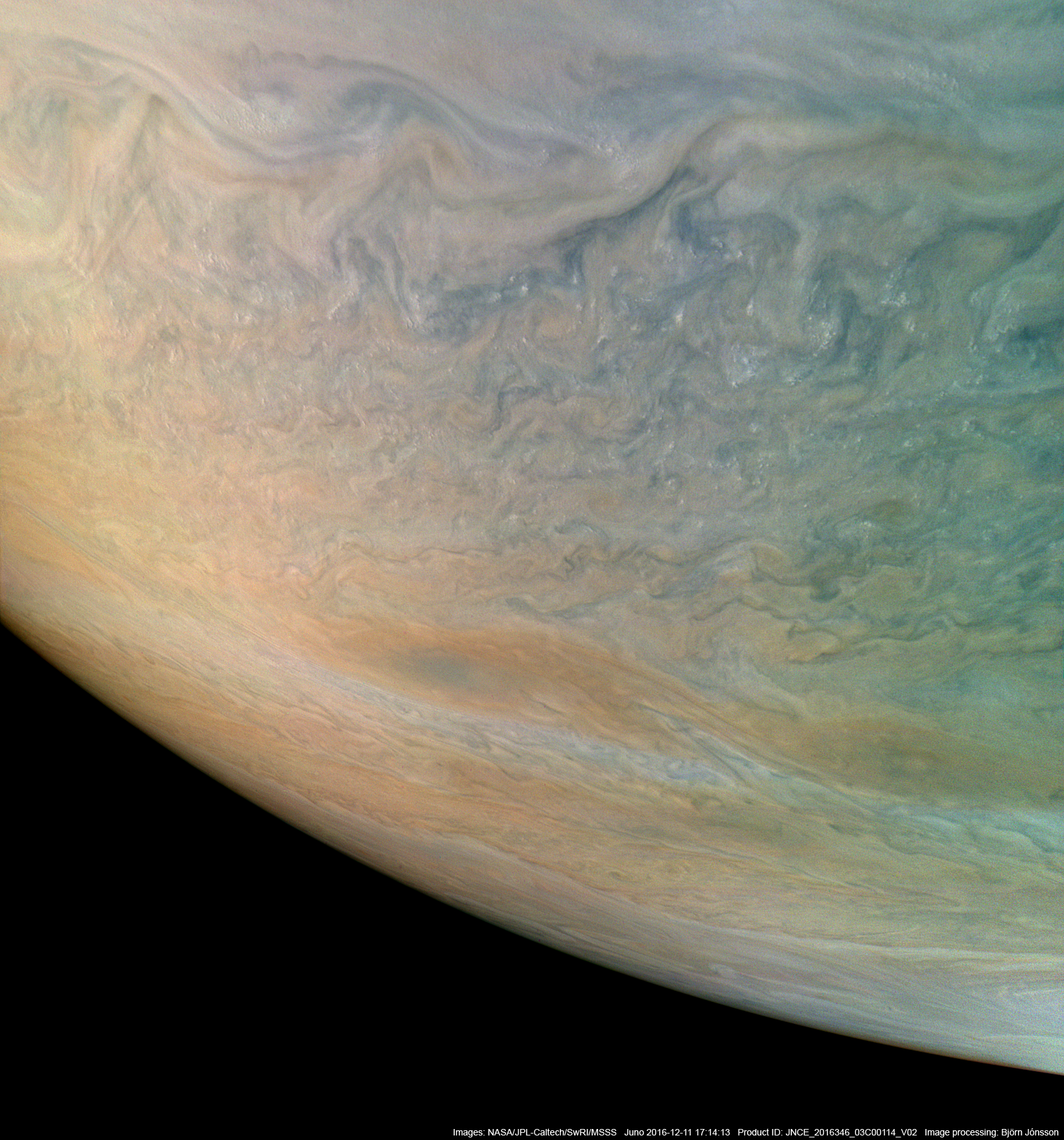 An image processed from the raw PJ3_114 image framelets. The contrast/color has been exaggerated and small scale features sharpened.