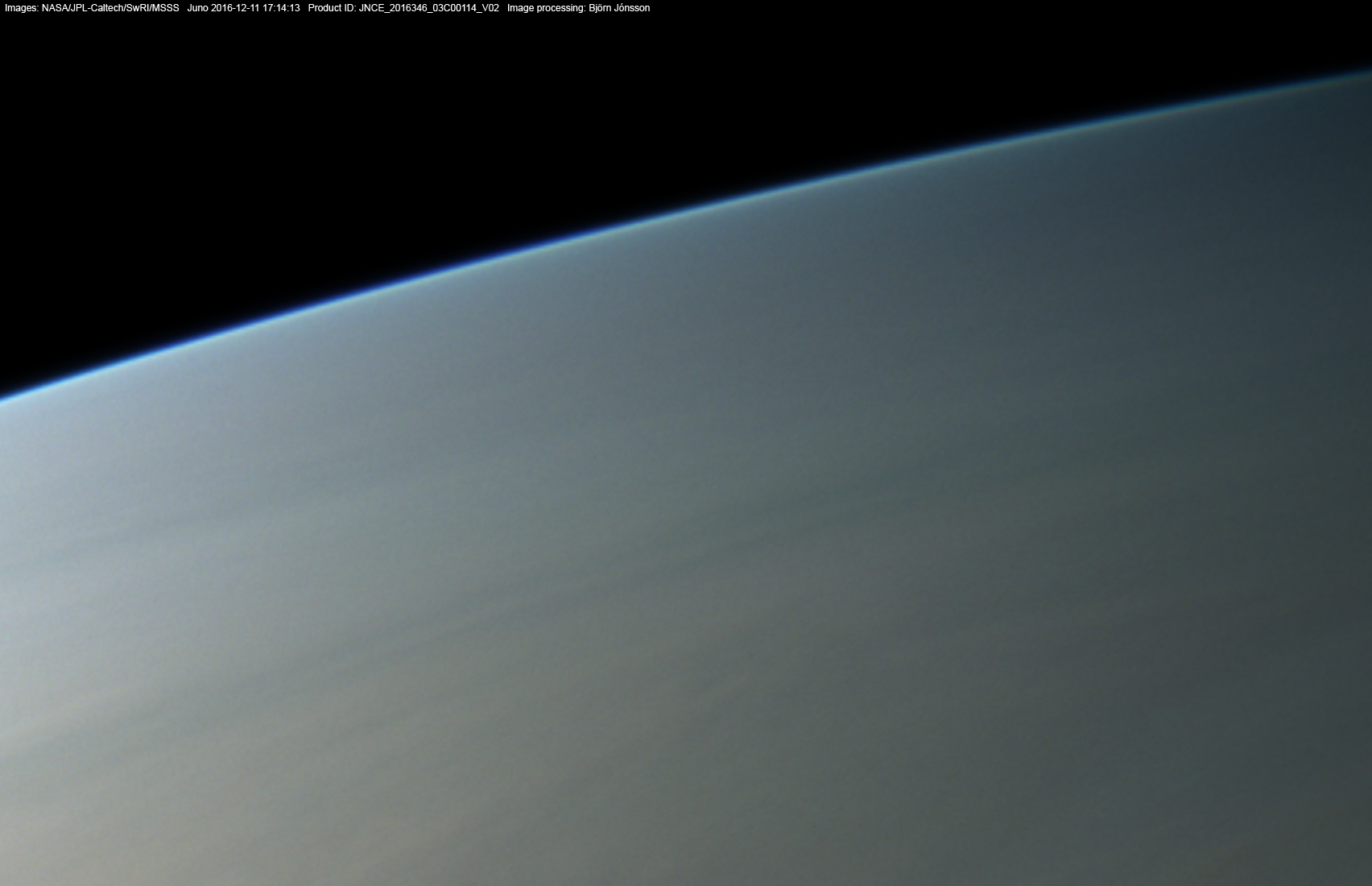 Details from a part of image PJ3_114. This is an approximately true color/contrast image that has been enlarged by a factor of 3 relative to the original, raw image data. The image shows Jupiter's horizon near the evening terminator. Jupiter's bright and blue evening sky is clearly visible at the limb. In the right half of the image there are also possible hints of a slightly more reddish color at lower altitudes than the blue color. This is probably a real feature although a processing artifact cannot be completely ruled out.