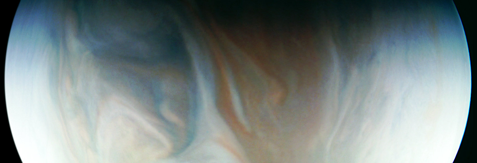 Juno's raw images were transformed, equalized and normalized, then - composed as RGB image. Resulting picture was also insignificantly tuned (contrast, sharping, color correction). Software used: GIMP 2.8.3. Raw image source: https://www.missionjuno.swri.edu/junocam/processing?id=632