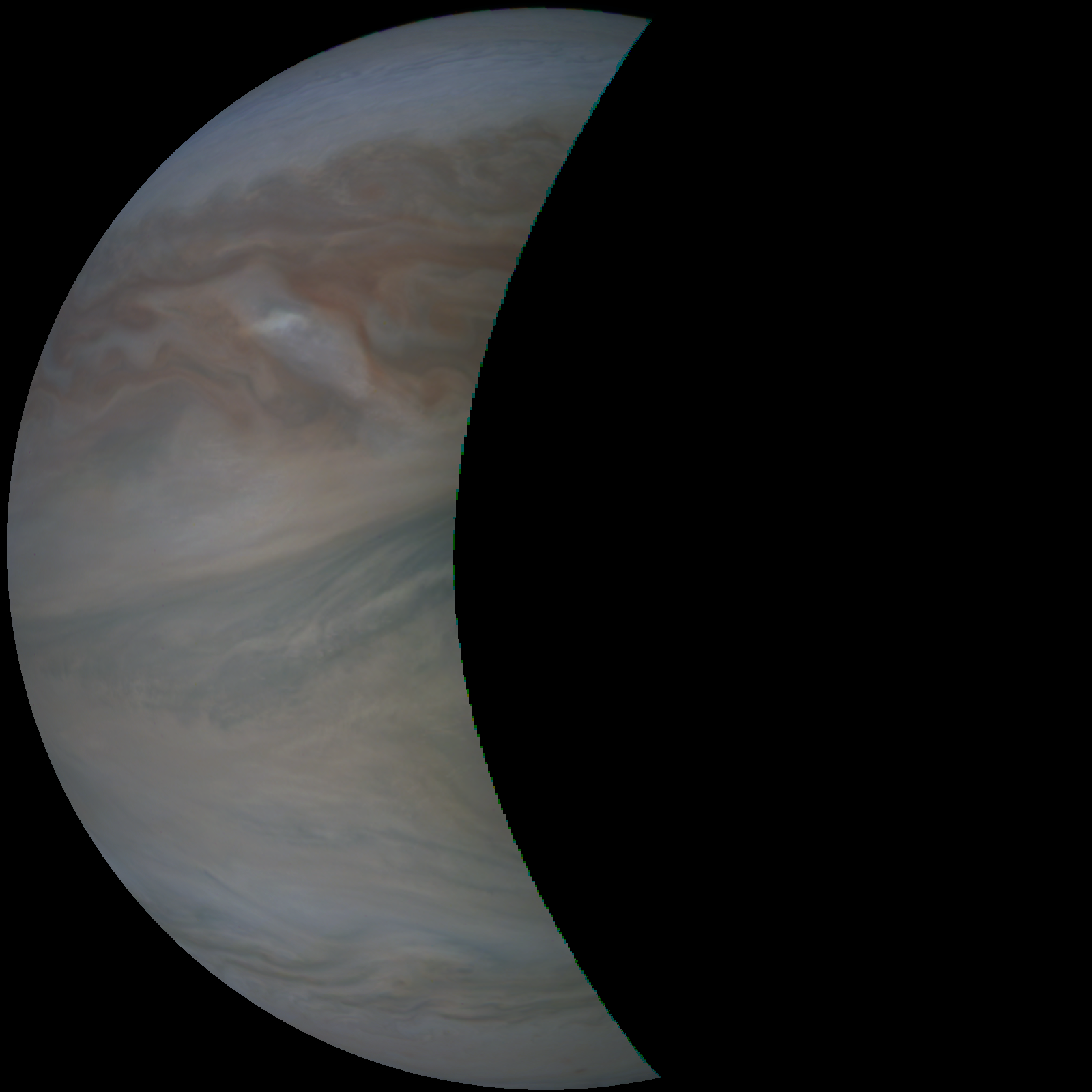 Junocam pixels are 12 bits deep from the camera but are converted to 8 bits inside the instrument using a lossless "companding" table, a process similar to gamma correction, to reduce their size. All Junocam products on the missionjuno website are in this 8-bit form as received on Earth. Scientific users interested in radiometric analysis should use the "RDR" data products archived with the Planetary Data System, which have been converted back to a linear 12-bit scale.