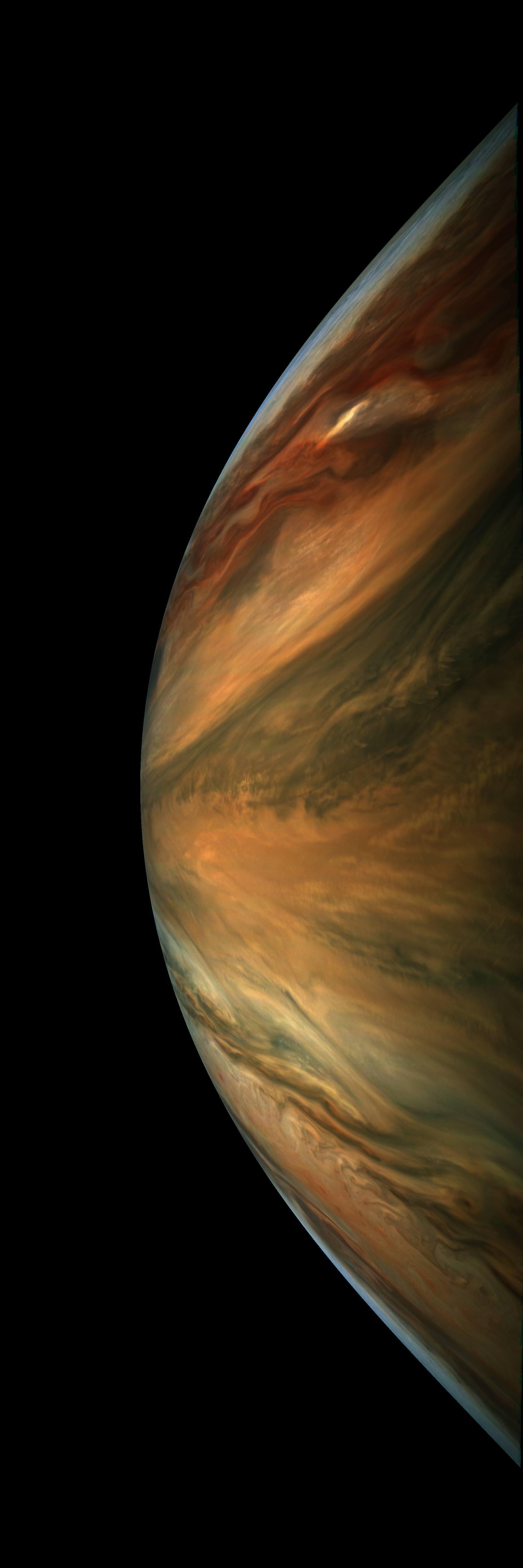 Junocam pixels are 12 bits deep from the camera but are converted to 8 bits inside the instrument using a lossless "companding" table, a process similar to gamma correction, to reduce their size. All Junocam products on the missionjuno website are in this 8-bit form as received on Earth. Scientific users interested in radiometric analysis should use the "RDR" data products archived with the Planetary Data System, which have been converted back to a linear 12-bit scale.