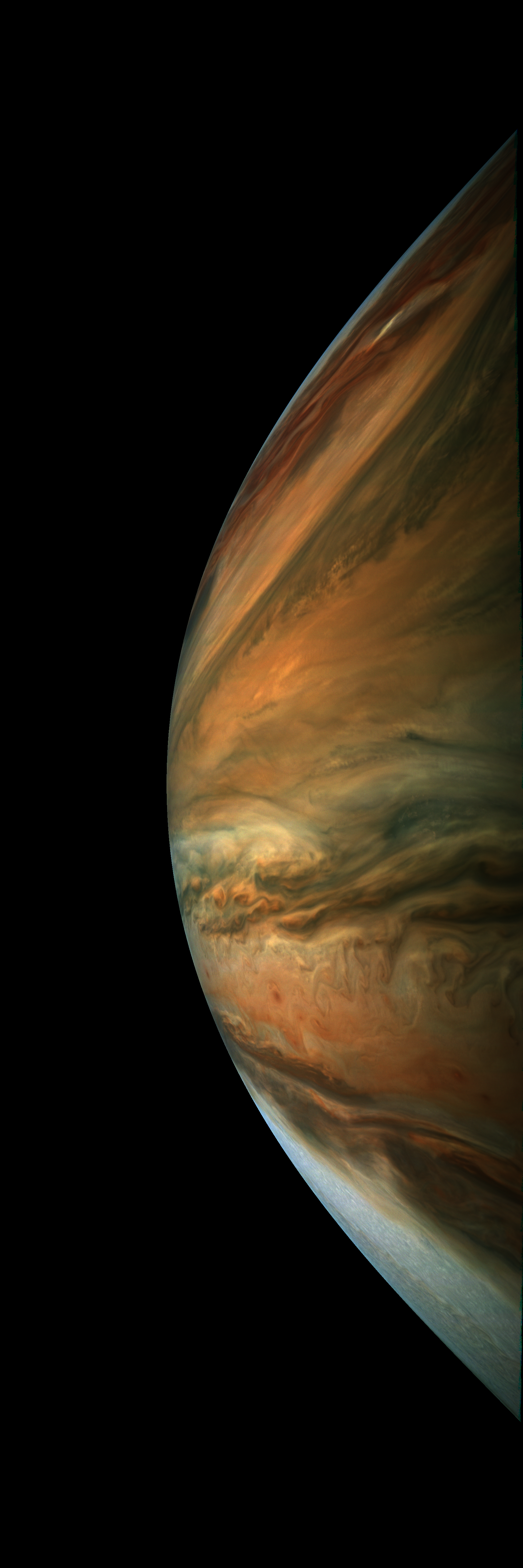 Junocam pixels are 12 bits deep from the camera but are converted to 8 bits inside the instrument using a lossless "companding" table, a process similar to gamma correction, to reduce their size. All Junocam products on the missionjuno website are in this 8-bit form as received on Earth. Scientific users interested in radiometric analysis should use the "RDR" data products archived with the Planetary Data System, which have been converted back to a linear 12-bit scale.