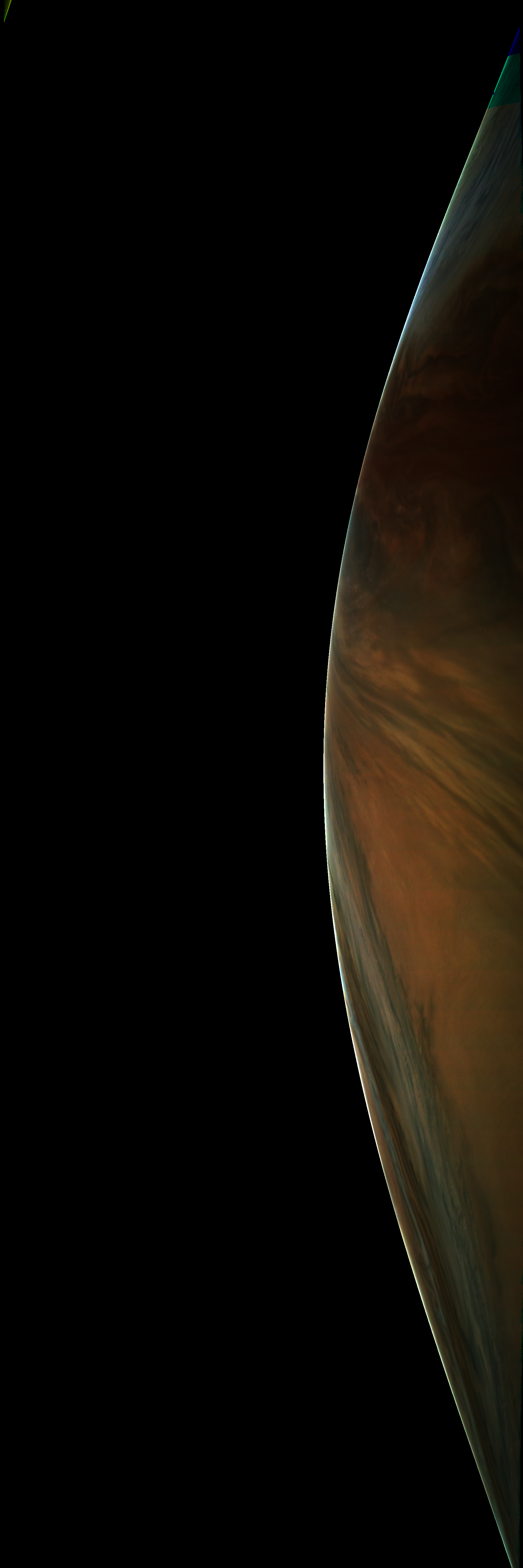 Resolution is 30 pixels per degrees in an equidistant cylindrical system centered to the camera at image stop time, with an axis parallel to Juno's spin axis. The rendered field of view is 60x180 degrees.