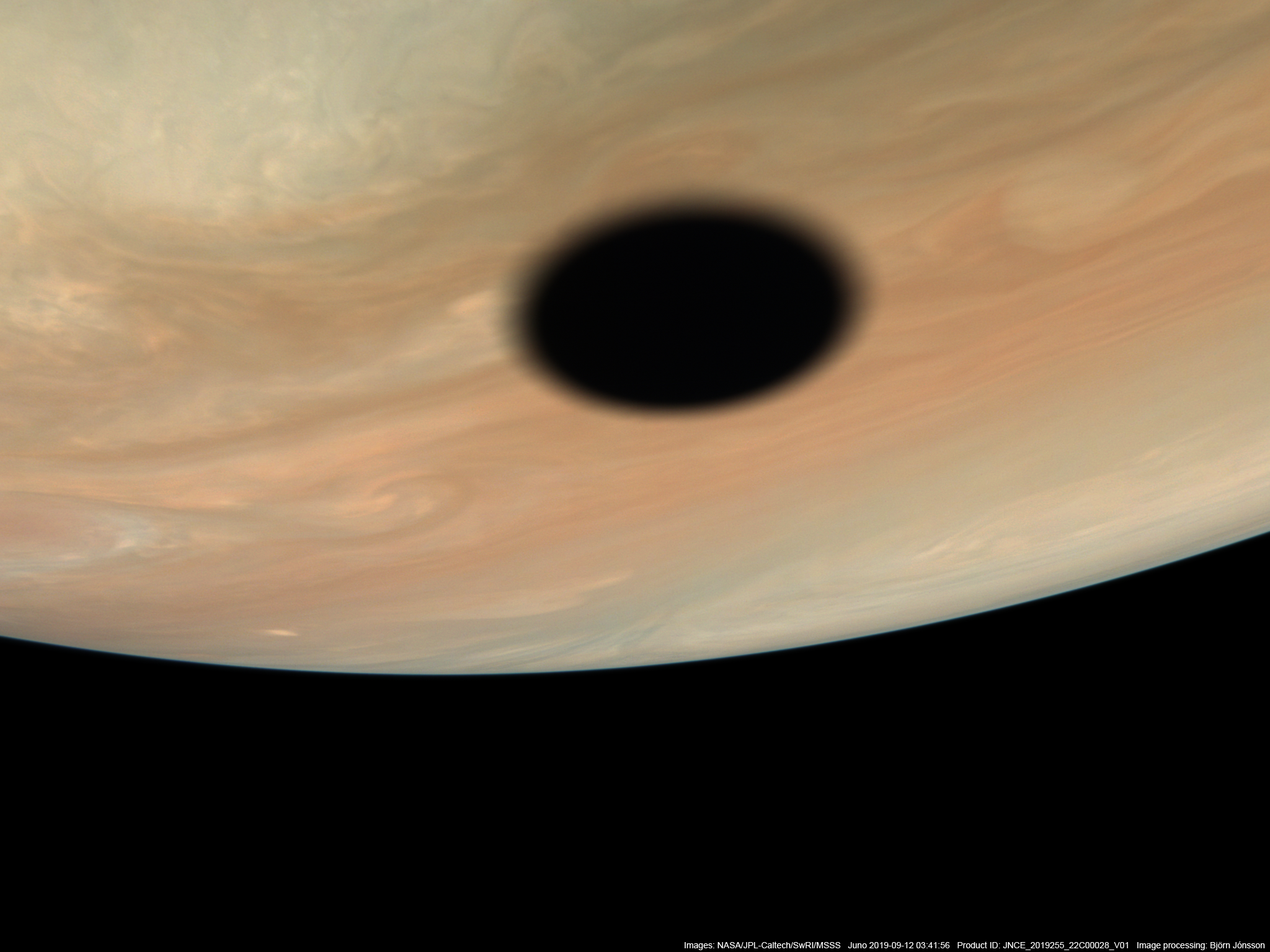 This approximately true color/contrast image shows what Jupiter and Io's shadow might have looked like to a typical consumer type camera (or even a phone) from Juno's location when JunoCam image PJ22_28 was obtained. The field of view is roughly comparable to the result from a typical consumer camera when no zoom is used. North is to the upper left. The distance to the center of Io's shadow is about 12,000 km.