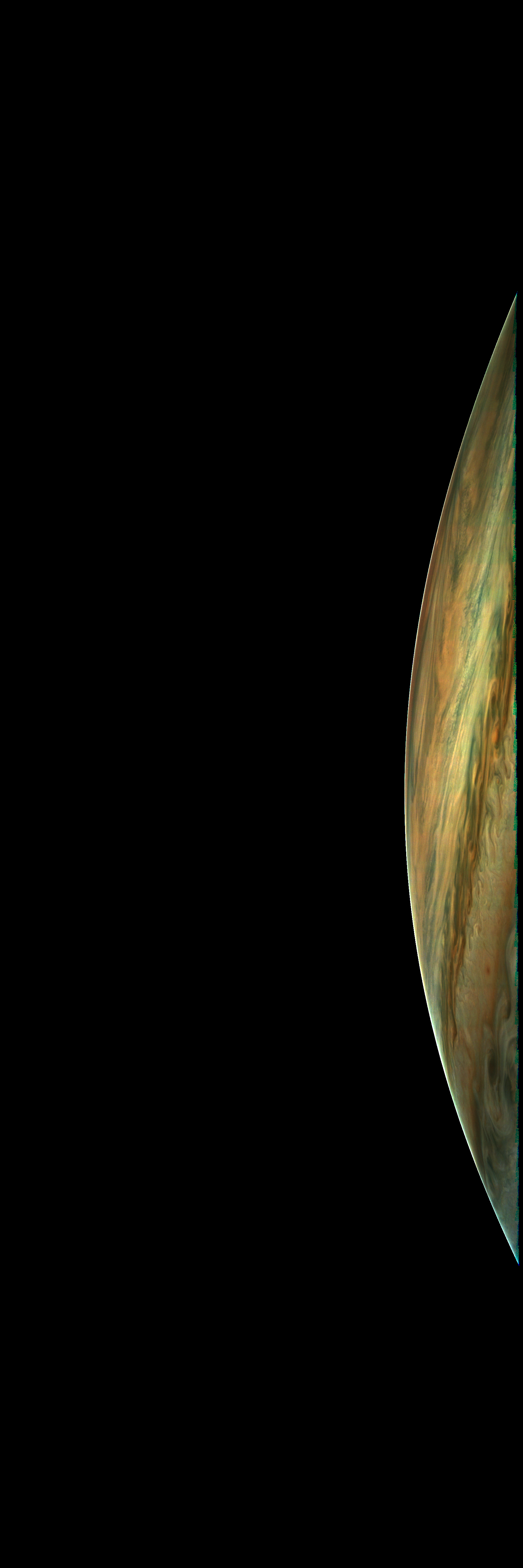 Resolution is 30 pixels per degrees in an equidistant cylindrical system centered to the camera at image stop time, with an axis parallel to Juno's spin axis. The rendered field of view is 60x180 degrees.