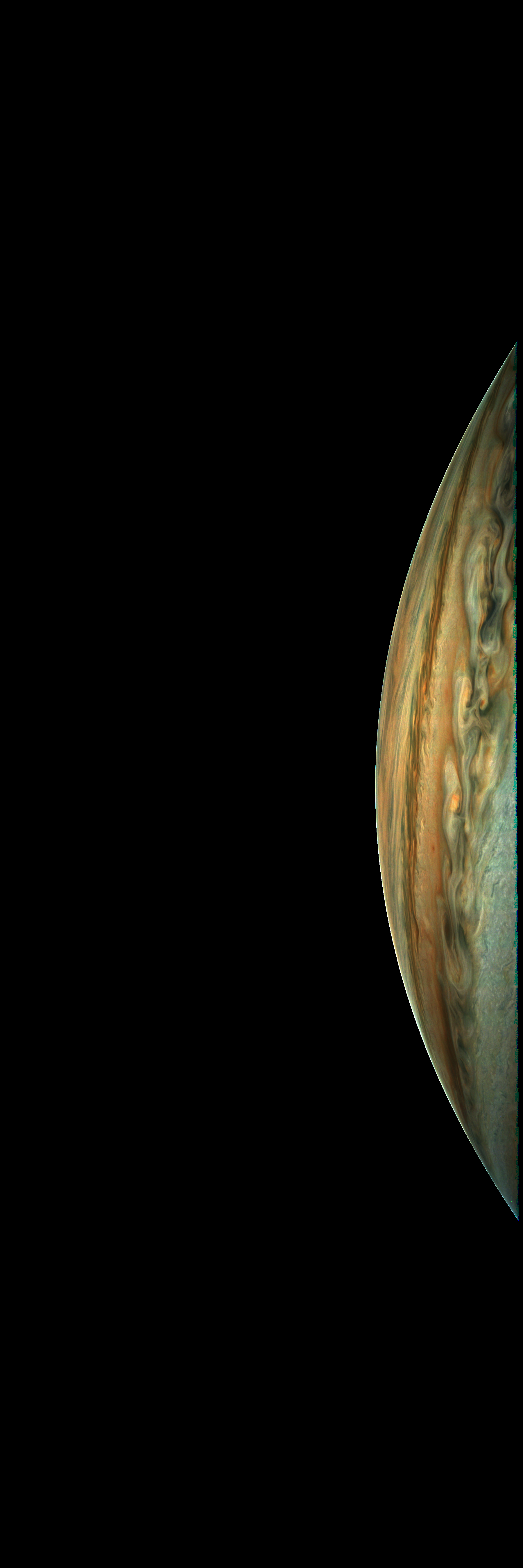 Resolution is 30 pixels per degrees in an equidistant cylindrical system centered to the camera at image stop time, with an axis parallel to Juno's spin axis. The rendered field of view is 60x180 degrees.