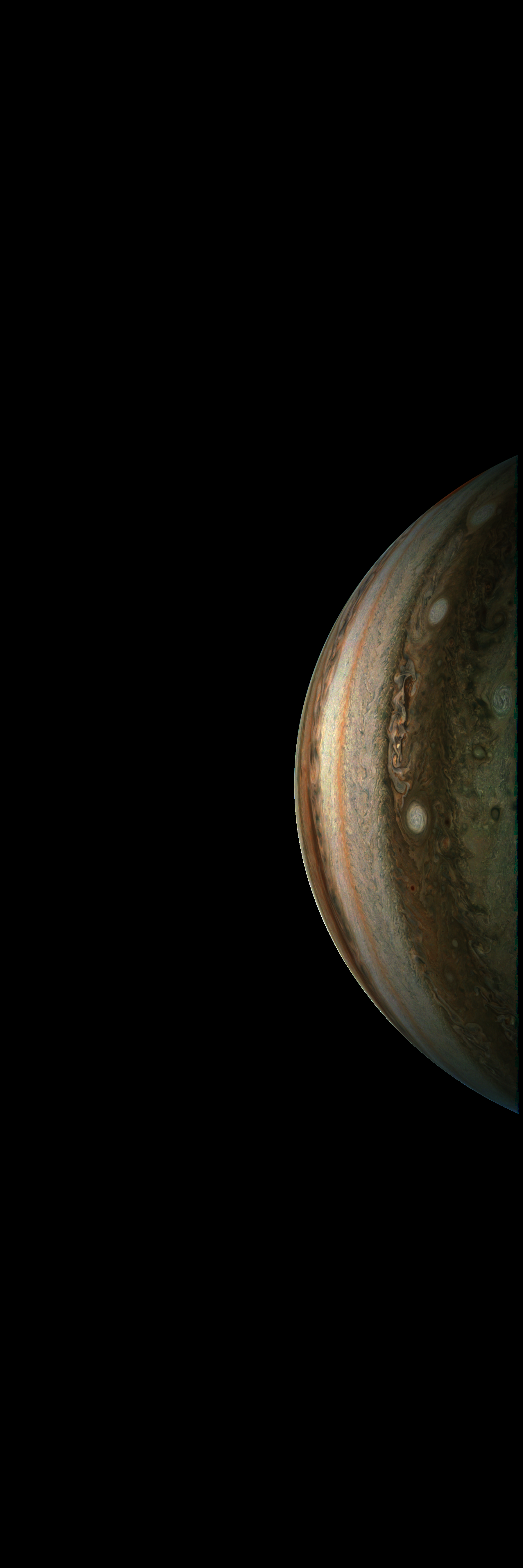 Resolution is 30 pixels per degrees in an equidistant cylindrical system centered to the camera at image stop time, with an axis parallel to Juno's spin axis. The rendered field of view is 60x180 degrees.