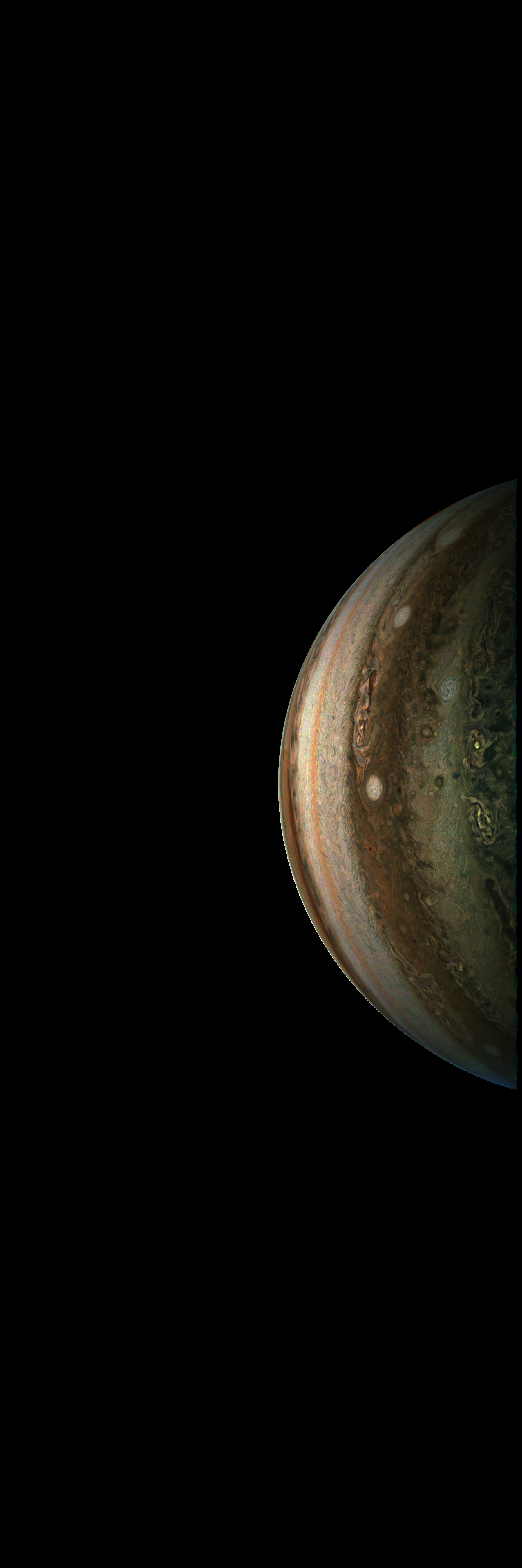 Resolution is 30 pixels per degrees in an equidistant cylindrical system centered to the camera at image stop time, with an axis parallel to Juno's spin axis. The rendered field of view is 60x180 degrees.