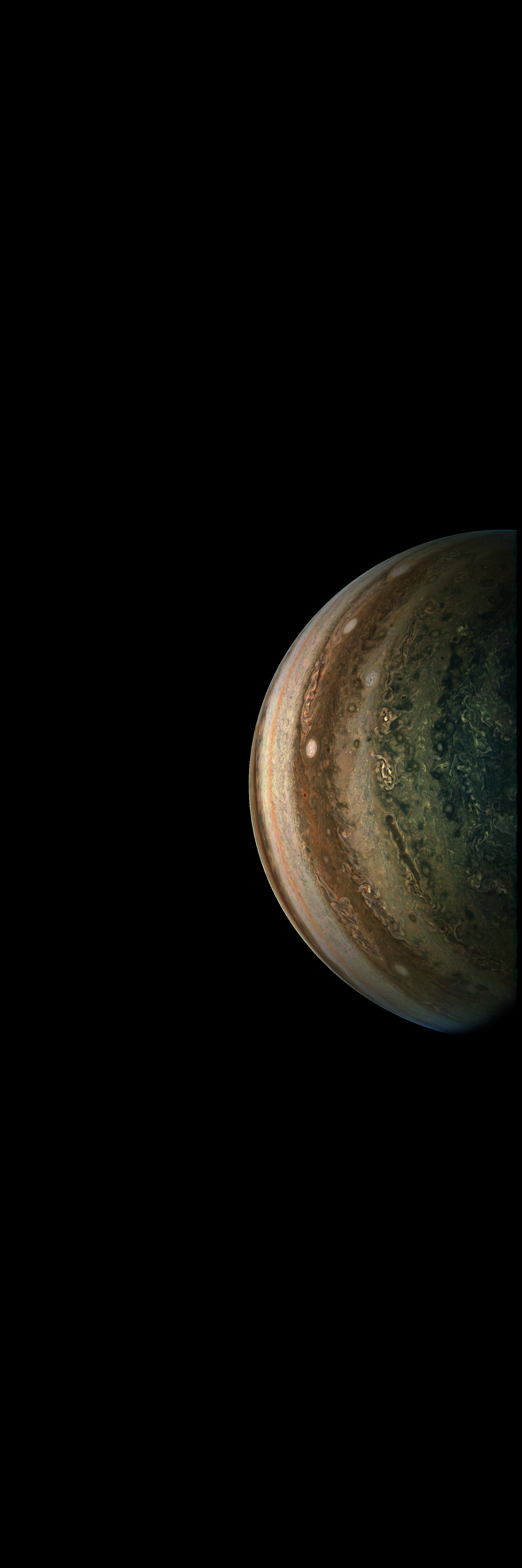 Resolution is 30 pixels per degrees in an equidistant cylindrical system centered to the camera at image stop time, with an axis parallel to Juno's spin axis. The rendered field of view is 60x180 degrees.