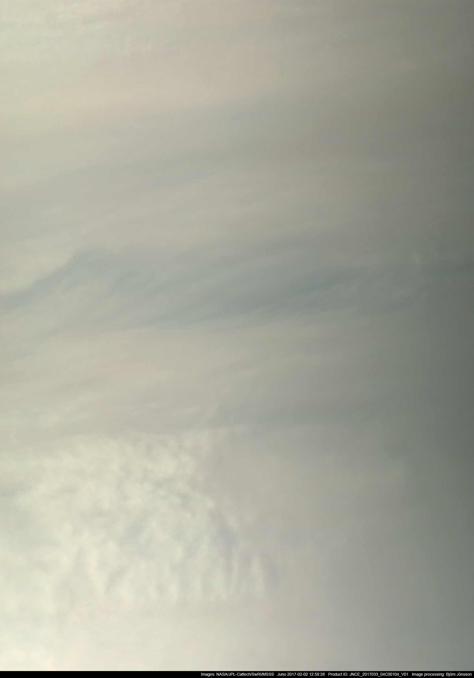 An approximately true color/contrast image processed from the PJ4_104 raw image framelets. This is a very high resolution image, the resolution is about 3 km/pixel near the center of the image.