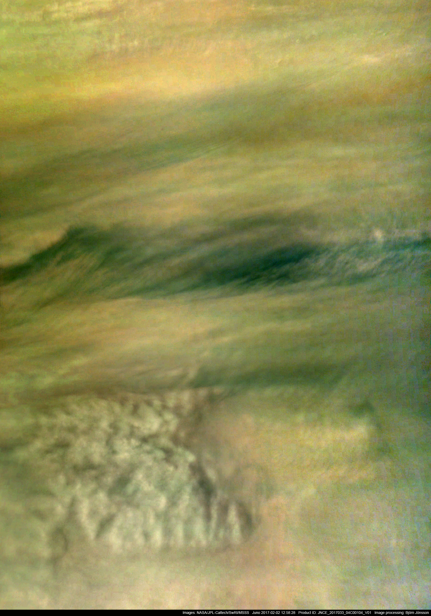 An image processed from the raw PJ4_104 image framelets. The contrast and color has been greatly exaggerated; the contrast was relatively low in the original image data. The processing parameters (for example amount of contrast stretch) differ for different parts of the image depending on the brightness and contrast of the original image data. This is a very high resolution image, the resolution is about 3 km/pixel near the center of the image.