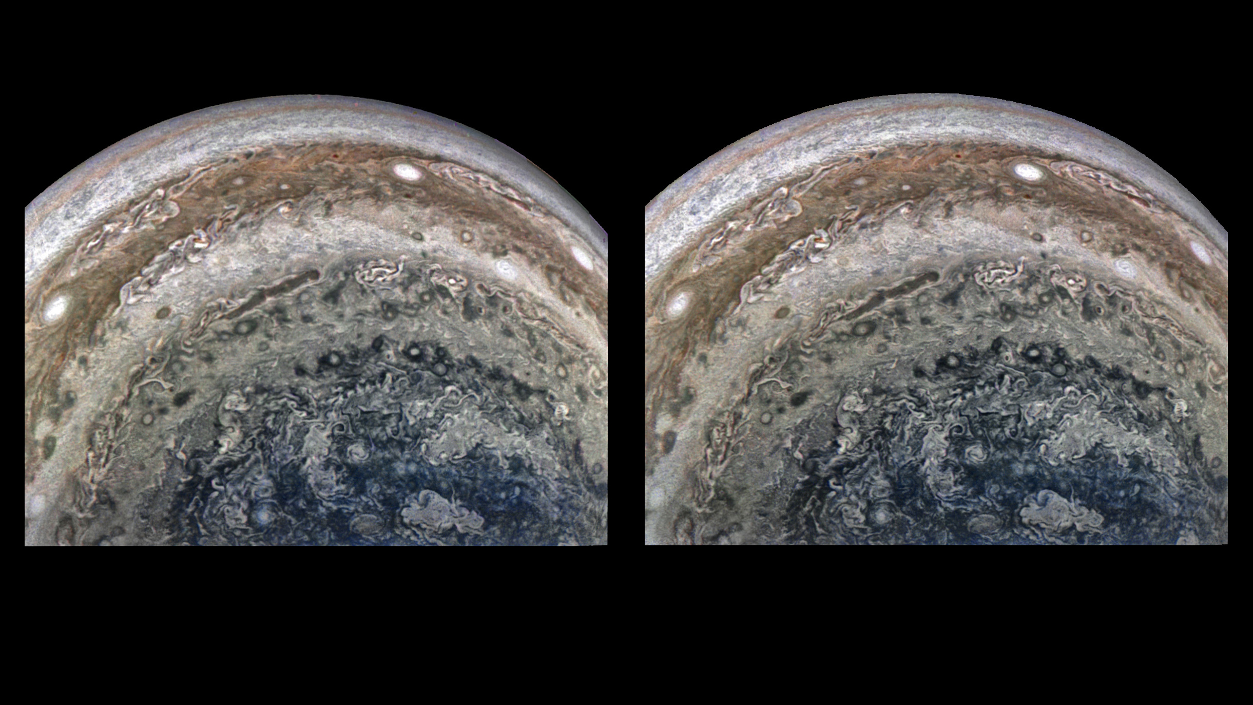 This is an actual stereograph, not an artificial 3D conversion made from a single 2D image. The 7 minutes 1.3 second interval between two JunoCam images taken during the time lapse sequence of Perijove 22 (12 September 2019 at 04:57:58.434 and 05:04:59.710 UTC) established a stereo base (camera separation) of thousands of kilometers, from which this stereographic image pair was crafted using Photoshop. Thanks to the velocity of Juno, the distance traveled during the interval between these two captures effectively gives our eyes that same separation. Viewing Jupiter at a known average altitude of 120,678.1 km (74,985.9 miles), it's nevertheless possible to perceive features of the atmosphere three dimensionally. Juno's actual speed and, thus, the stereo base for this image pair from Perijove 22, is unknown (at least to the creator of this stereograph). Note that during the 7 minutes 1.3 second interval, Juno ascended 11,680.2 km (7257.7 miles), from 114,838.0 km to 126,518.2 km (a 10.17% gain in altitude), requiring z-axis correction in addition to x- and y-axis skewing, to produce the stereograph. Also: Dissimilar but radially thin slivers of the horizon were trimmed from both of the source images to eliminate uncorrectable retinal rivalry seen when fusing the image pair and to exclude some RGB artifacts that can be seen at the horizon in the original images.