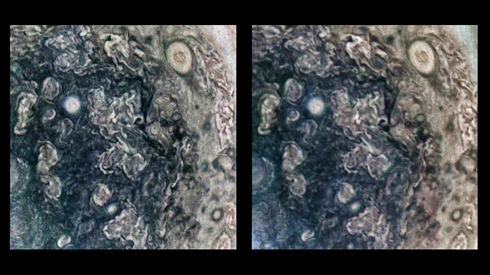 This is an actual stereograph, not an artificial 3D conversion made from a single 2D image. The 23-minute 52.9-second interval between two JunoCam images taken during the time lapse sequence of Perijove 20 (29 May 2019 at 09:28:28.990 and 09:52:21.844 UTC) established a stereo base (camera separation) of thousands of kilometers, from which this stereographic image pair was crafted using Photoshop. Thanks to the velocity of Juno, the distance traveled during the interval between these two captures effectively gives our eyes that same separation. Viewing Jupiter at a known average altitude of 139,608.85 km (86,748.8 miles),